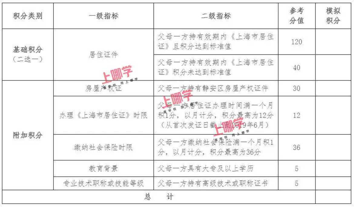 2019年静安区来沪人员随迁子女模拟积分表