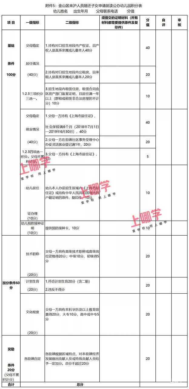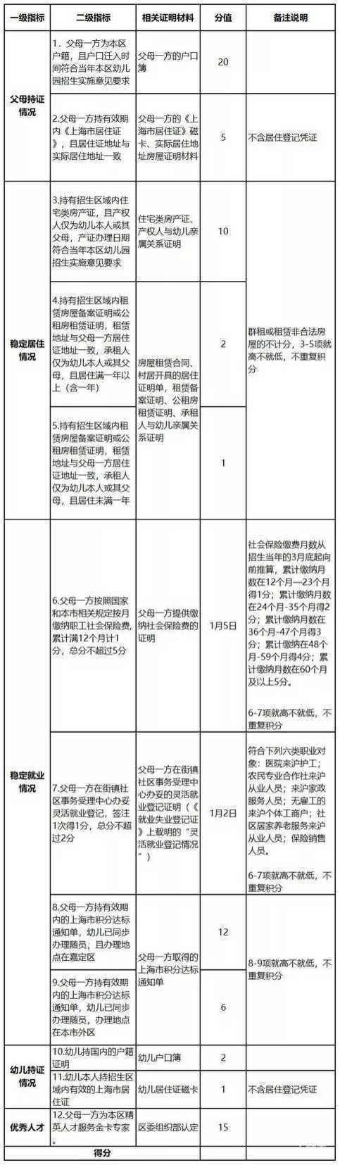 嘉定区来沪人员随迁子女申请就读幼儿园积分表