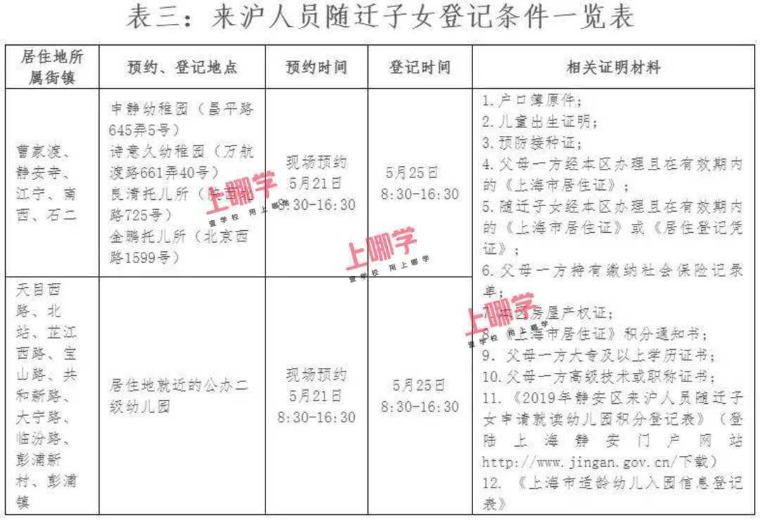 非本市户籍来沪人员随迁子女:幼儿本人须持有效期内《上海市居住证》或《居住登记凭证》(居住地址在本区),父母一方须持有效期内《上海市居住证》(居住地址在本区),且一年内参加本市职工社会保险满6个月(2018年7月1日至2019年6月30日,不含补缴)或连续3年(从首次登记日起至2019年6月30日)在本区街镇社区事务中心办妥灵活就业登记。有产证的,按房产证地址就近安排入园;无房产证的,凭本区合法居住证明,根据实际居住地址,统筹安排入园。