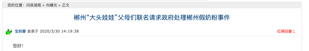 2020 年 3 月,一些家长在「问政湖南」发表联名信,要求政府处理郴州假奶粉「舒儿呔固体饮料」事件。