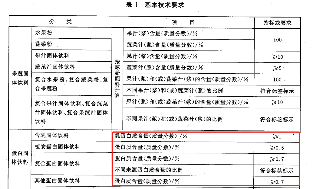 而固体饮料执行的国家标准 GB/T29602 中,只有蛋白质含量达到 0.5%~1% 这一个要求。