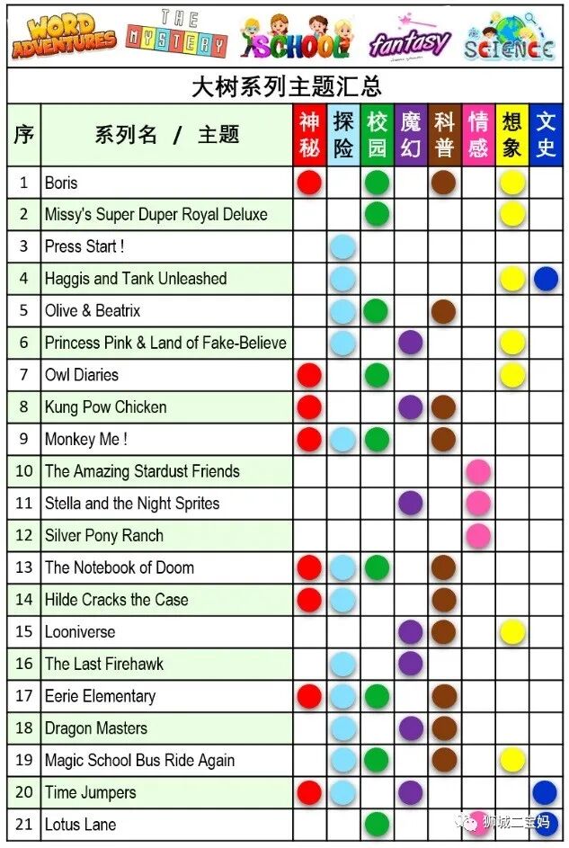 学乐大树涵盖了21个主题风格迥异的系列,共120单本。分为两大类: 1). 初阶彩色插图,8个系列,单本72至80页;2). 进阶黑白配图,12个系列,单本85至96页。