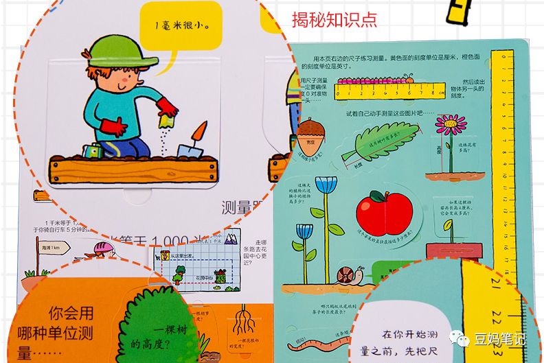虽然书里很多是知识点的罗列,但却一点也不枯燥。比如讲测量长度的时候,会告诉小朋友测量一件物体的长度时,要选择最适合的单位,特别小的物体用毫米、稍大一些的用厘米、测量更长物体或者距离的时候,用米或者千米。图画里的例子很形象。