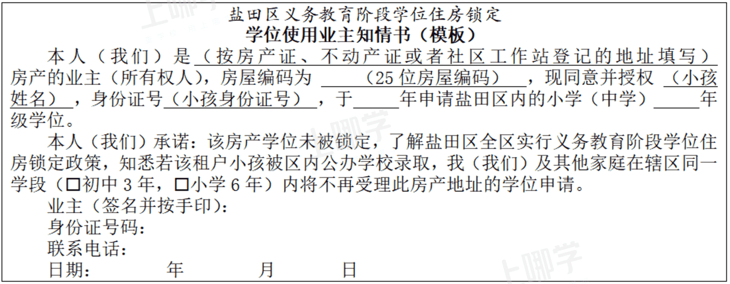 ④非自有产权房的须提供由业主签字并按手印同意的《学位使用业主知情书》。非自有产权房的盐田户籍申请人且在盐田区实际居住的,其所租住的房屋因已被锁定或无法锁定而无法提供《学位使用业主知情书》的,需签署《学位申请服从调剂承诺书》,由区教育局在全区范围内统筹派发学位。《学位使用业主知情书》模板如下。