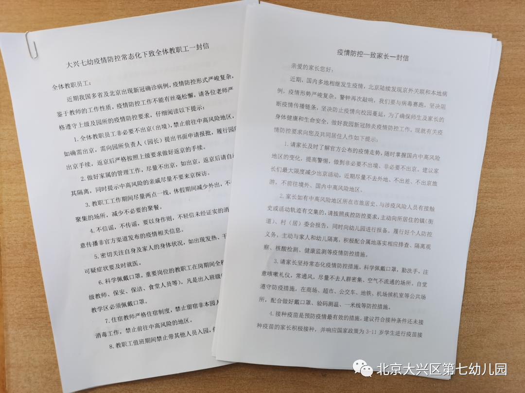 我园发放了《疫情防控致家长一封信》及《疫情防控致全体教职工一封信》,倡议广大师生及家长遵守疫情防控要求,落实主体责任。