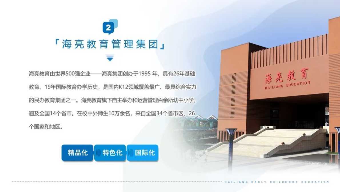海亮教育由世界500强企业——海亮集团创办于1995 年,具有26年基础教育、19年国际教育办学历史,是国内K12领域覆盖最广、最具综合实力的民办教育集团之一。海亮教育旗下自主举办和运营管理百余所幼中小学,遍及全国14个省市。在校中外师生10万余名,来自全国34个省市区、26个国家和地区。