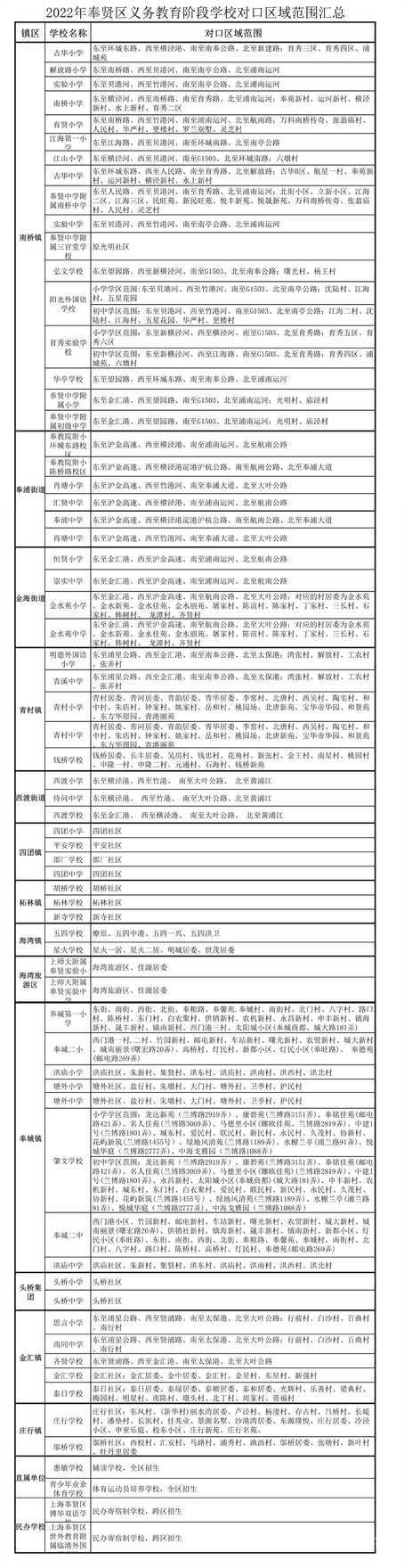 文章-2022年奉贤区义务教育阶段学校学区划分