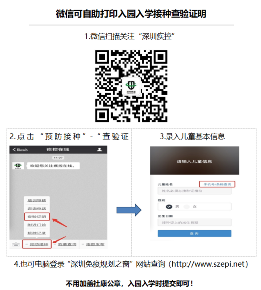 2、交居住片区所辖社康的免疫接种证明(拿孩子的预防接种本去社康登记,然后按下面的微信二维码扫描打印即可)。