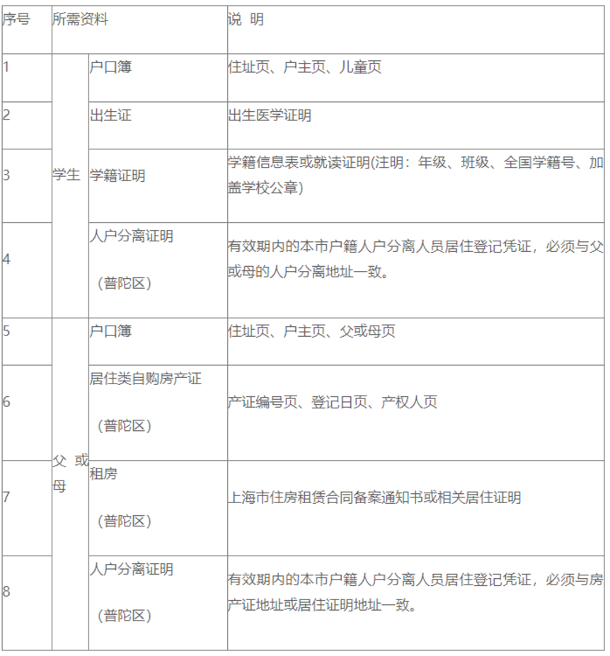 2.学生为外省市户籍,且居住在本区的,须提供以下材料: (1)学生父母一方持有效期内的“上海市居住证”且积分达到标准积分(目前标准积分为120分),提供下表序号1-6、8(或9)的材料; (2)学生父母一方持有效期内的“上海市居住证”且一年内(2024年7月1日至2025年6月30日)参加本市职工社会保险满6个月(不含补缴),或学生父母一方持有效期内的“上海市居住证”且连续3年(从首次登记日起至2025年6月30日)办妥灵活就业登记,提供下表序号1-5、7、8(或9)的材料。