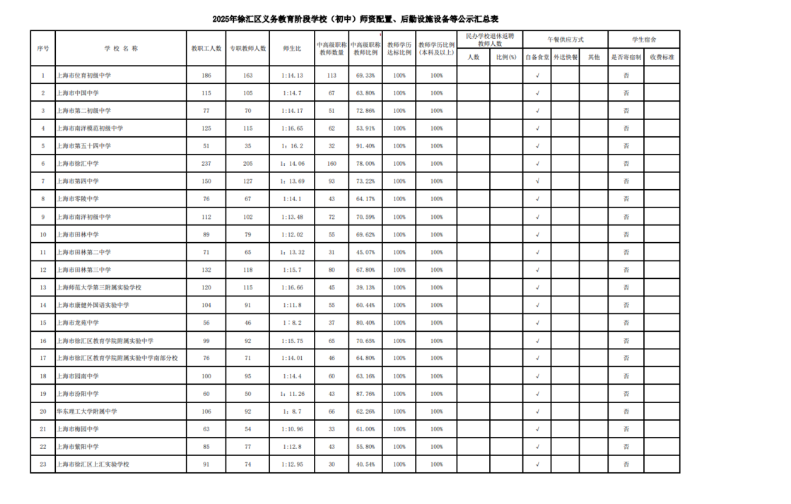 文章-2025年徐汇区义务教育阶段学校(初中)师资配置、后勤设施设备等公示汇总表
