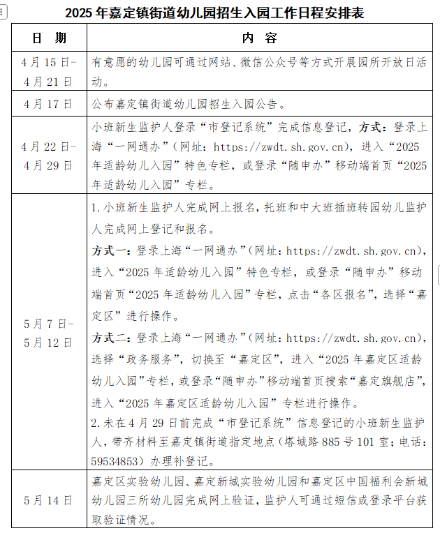 4月24日-4月30日,“市登记系统”(https://shrydj.edu.sh.cn)开通,小班新生家长网上完成信息登记,点击“嘉定区”报名窗口查询本区招生工作政策。