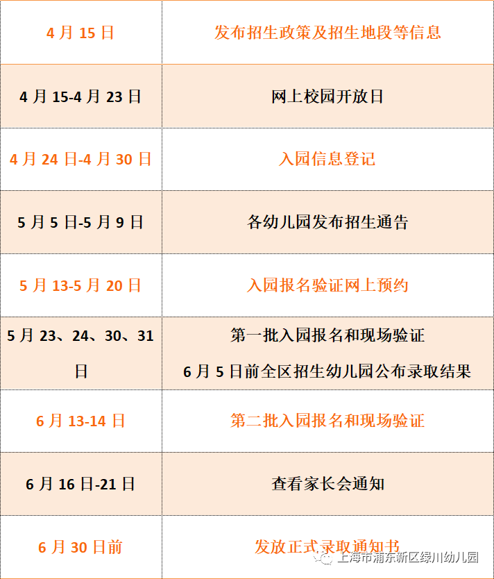 根据《浦东新区教育局关于2022年本区学前教育阶段适龄幼儿入园工作的实施意见》,结合本园实际,为公开、公平、公正做好本园2022年招生入园工作,现将有关事项告示如下: 招生范围 1、【博华部】招生范围: 博华路930弄 博华路971弄 博华路980弄 博华路999弄 博华路1018弄 联勤村 2、【锦绣部】招生范围: 绿林路50弄 绿林路51弄 绿林路52弄 绿林路320弄 锦绣路3841弄 陈春路620弄 ********************************************* 招生计划 *************************************************************** 招生对象 2018年9月1日至2019年8月31日期间出生,年满3周岁的适龄幼儿。 1、本区户籍、人户一致的适龄幼儿:按幼儿本区常住户籍地址对口入园。须持有2022年6月30日前办理的招生区域内户籍和相对应的住宅类房产证。户主为幼儿的父母、祖父母或外祖父母之一,且户主本人须为房屋产权人(单独所有或共同共有全部产权);幼儿本人为户主的,房屋产权人须为幼儿本人(单独所有或共同共有全部产权)或其父母(单独所有或共同共有全部产权)。当入园适龄幼儿人数超出幼儿园招生计划数,按照幼儿户籍迁入时间先后排序入园,超额部分作统筹安排。 2、本市户籍、人户分离(居住地具备相应房产证)的适龄幼儿:按房产证地址就近入园。须持有2022年6月30日前办理的招生区域内住宅类房产证。房屋产权人须为幼儿本人(单独所有或共同共有全部产权)或其父母(单独所有或共同共有全部产权)。待区域内户籍与房产一致的幼儿安排后,视幼儿园招生情况,按房产证地址就近安排入园。当入园适龄幼儿人数超出幼儿园招生计划数,按照幼儿户籍和产证情况排序入园,超额部分作统筹安排。 本市户籍廉租房或经济适用房(承租人或买受人须是幼儿父母)的适龄幼儿参照执行。 3、本市外区户籍、人户分离(在居住地无相应房产证)的适龄幼儿:本市外区户籍的幼儿确有困难,不能在户籍地入园,凭街(镇)社区事务受理服务中心出具的《本市户籍人户分离人员居住登记(回执)》,按居住地统筹安排入园。 4、父母一方持有效期内《上海市居住证》(居住证上的居住地址在本区)且积分达标准分值的适龄幼儿:须持有2022年6月30日前办理的招生区域内住宅类房产证,房屋产权人须为幼儿本人(单独所有或共同共有全部产权)或其父母(单独所有或共同共有全部产权)。参照本市户籍、人户分离(居住地具备相应房产证)的幼儿,按房产证地址就近入园。当入园适龄幼儿人数超出幼儿园招生计划数,按照幼儿及父母居住证和产证情况排序入园,超额部分作统筹安排。无房产证的,凭本区合法居住证明,统筹安排入园。 5、动迁户适龄幼儿:因动迁原因,户籍尚未迁移至安置地的或居住的安置房产尚未办理产证的,如动迁安置地配套幼儿园已具备招生条件,可凭动迁协议书安置地址就近安排入园。租赁房屋居住的,凭本区合法居住证明,统筹安排入园。 6、其余符合条件的来沪人员适龄随迁子女:幼儿本人须持有效期内《上海市居住证》或《居住登记凭证》,父母一方须持有效期内《上海市居住证》,且一年内参加本市职工社会保险满6个月(2021年7月1日至2022年6月30日)或连续3年(从首次登记日起至2022年6月30日)在街镇社区事务中心办妥灵活就业登记。2022年因受疫情影响将适度放宽来沪人员随迁子女入园有关条件。 来沪人员适龄随迁子女,申请在本区就读的,其所持的居住证上的居住地址,应与其父母保持一致,且居住地址在本区。持有2022年6月30日前办理的招生区域内住宅类房产证的,房屋产权人须为幼儿本人(单独所有或共同共有全部产权)或其父母(单独所有或共同共有全部产权),按房产证地址,统筹安排入园。无房产证的,凭本区合法居住证明,根据各公民办幼儿园第一批报名验证情况,统筹安排至尚有余额的公办幼儿园或民办三级幼儿园。幼儿园可按照“浦东新区来沪人员随迁子女统筹入园积分表”分值高低排序,视学位情况统筹安排入园。 7、香港、澳门、台湾适龄幼儿:香港、澳门幼儿须持本人香港或澳门永久居民身份证、港澳居民来往内地通行证和本市《境外人员住宿登记表》或《中华人民共和国港澳居民居住证》;台湾幼儿须持本人台湾居民来往大陆通行证和本市《境外人员住宿登记表》或《中华人民共和国台湾居民居住证》,统筹安排入园。 8、外籍适龄幼儿:外籍幼儿须持本人有效签证外国护照(须有中华人民共和国外国人居留许可页,且有有效往来签证)和本市《境外人员住宿登记表》,统筹安排入园。 9、特殊幼儿:有特殊教育需求的幼儿须持有本区户籍,可向爱心幼儿园或上南三村幼儿园、童心幼儿园、临港新城海音幼儿园、致立学校申请入读学前特教班。 10、其他符合入园条件的幼儿:除上述情况以外,其他符合在本区入园条件的幼儿,视实际情况统筹安排入园。 **************************** 网上报名验证时间和办法 陈春路611号(绿川幼儿园锦绣部) *************************** 其他事项 1、8月15日前,幼儿园将完成新生录取通知工作,发放录取通知书。 2、本园招生咨询电话:13482037878 ,联系人:康老师