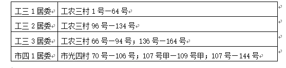 、工农三村96号—134号、工三3居委、工农三村66号—94号、136号—164号、市四1居委、市光四村70号—106号;107号甲—109号甲;107号—144号