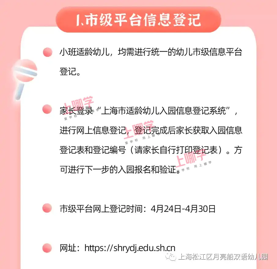 *家长登录“上海市适龄幼儿入园信息登记系统”,进行网上信息登记,获取登记表(市级平台自行打印)和登记编号。登记完成后家长获取入园信息登记表和登记编号,方可进行下一步的入园报名和验证。