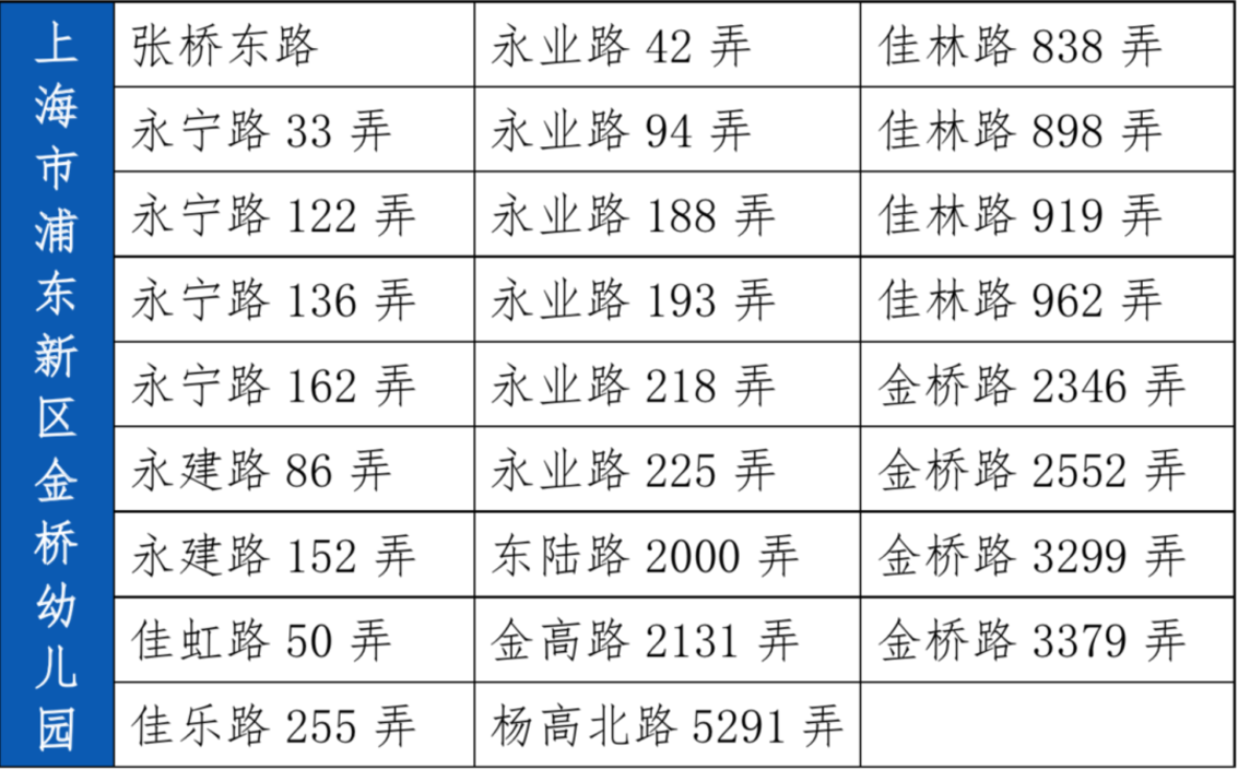 上海市浦东新区金桥幼儿园 (总部) | 张桥东路 | 张桥小区 |