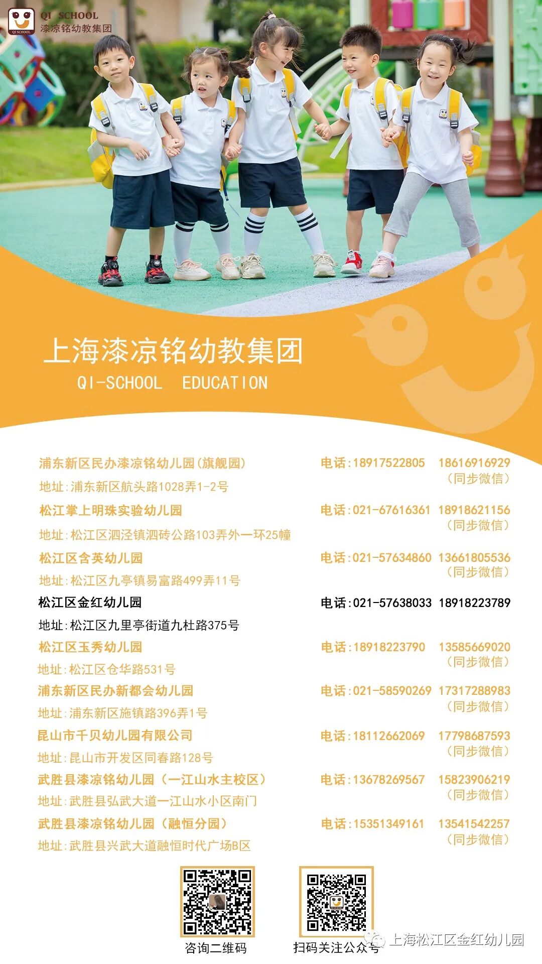 上海松江区金红幼儿园2020年秋季招生工作已全面启动啦!欢迎前来报名! 报名流程 4月24日——4月30日登录”上海市适龄幼儿入园信息登记系统“→金红幼儿园网上预约登记或电话预约登记→现场参观报名确认→新生体验日 扫二维码进行预约信息、时间登记 报名注意事项 1、请家长后续幼儿园电话或微信预约时间段,持“上海市适龄幼儿入园信息登记”表及相关的证件原件及复印件来园进行验证报名! 报名方式 请各位家长准备好报名材料,至幼儿园报名处报名。如有疑问,欢迎来电咨询! 松江区九杜路371~373号 (一楼报名咨询处) 021-57638033(办公室) 18918223789(毛老师) 18918223788(梅老师) 17749798613(曹老师) 周一至周五(8:30—17:30) ▸ 全体老师期待你的加入哦!! !