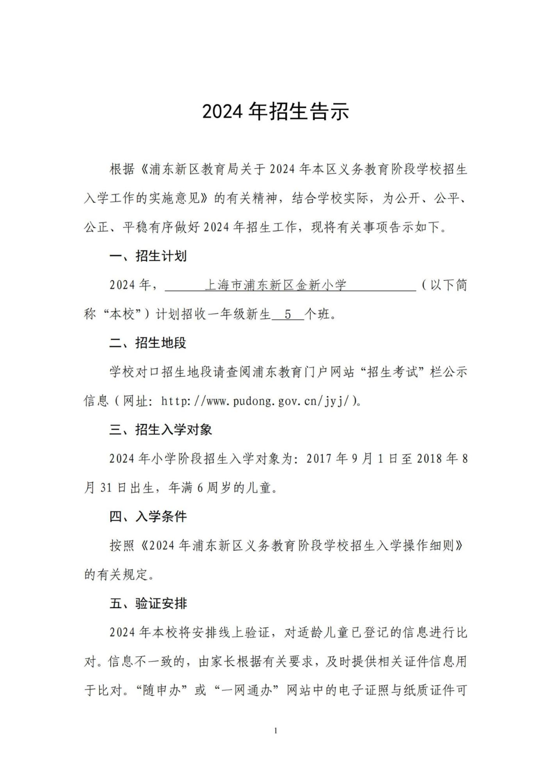 2021 年,上海市浦东新区金新小学(以下简称“本校”)计划招收一年级新生5个班。