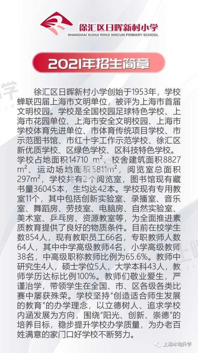 徐汇区日晖新村小学创始于 1953 年,学校蝉联四届上海市文明单位,是上海市首届文明校园。学校是全国校园足球特色学校、上海市花园单位、上海市安全文明校园、上海市学校体育先进单位、市体育传统项目学校、市绿色学校、市示范图书馆、市红十字工作示范学校、徐汇区新优质学校、区科技特色学校。