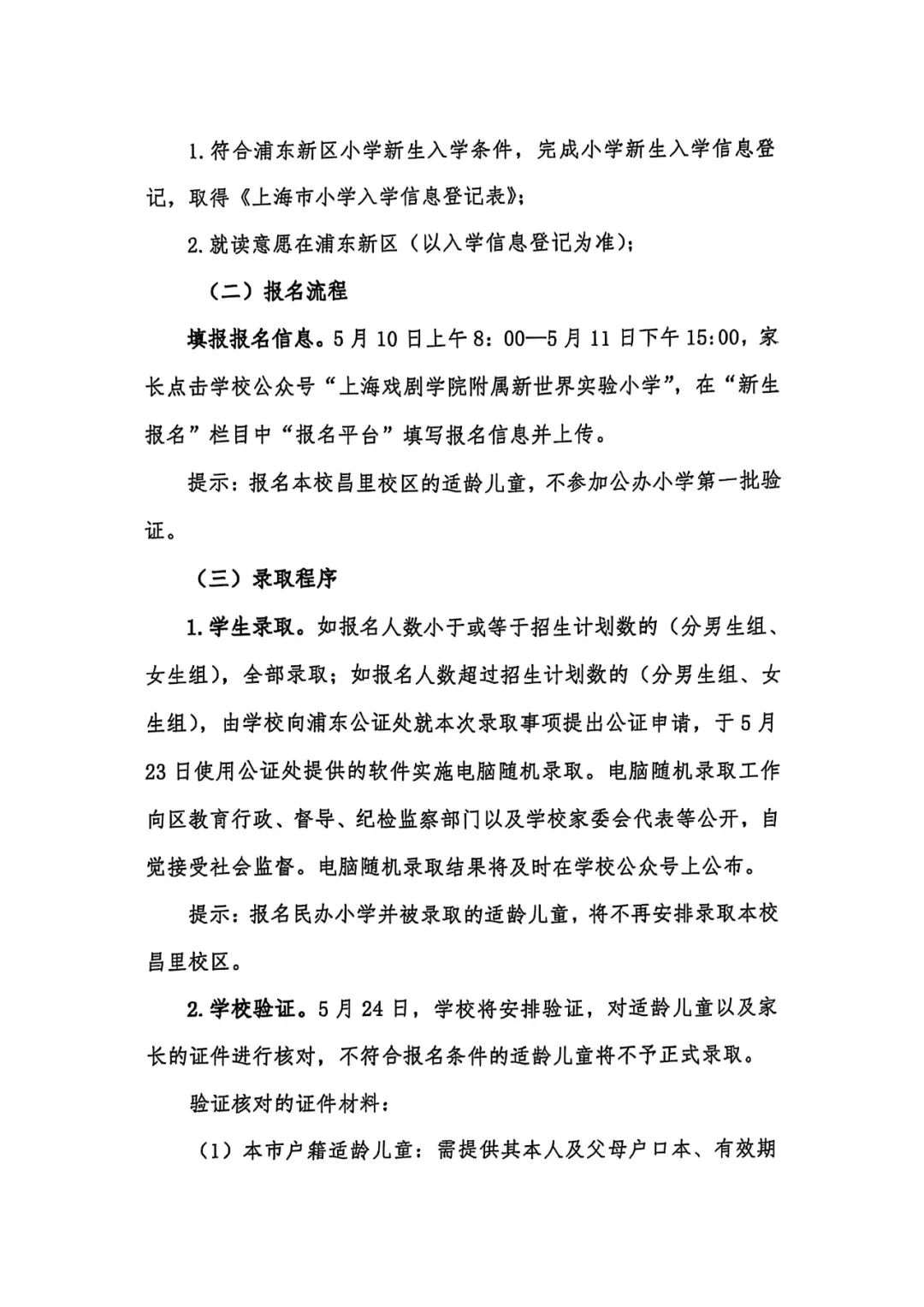 1.符合浦东新区小学新生入学条件,完成小学新生入学信息登记,取得《上海市小学入