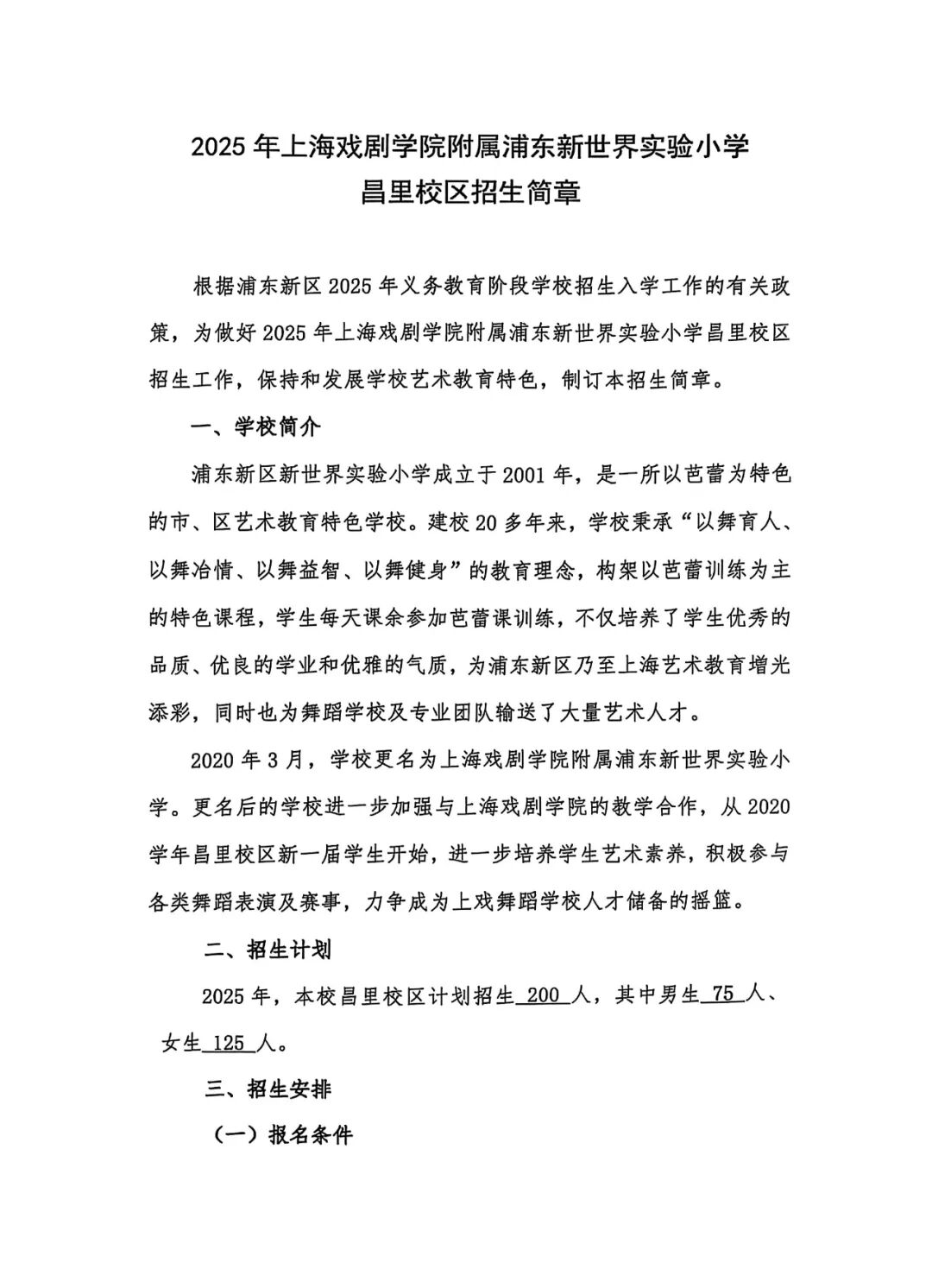 根据浦东新区2021年义务教育阶段学校招生入学工作的有关政策,为做好2021年上海戏 剧学院附属新世界实验小学昌里校区招生工作,保持和发展学校艺术教育特色,制订本招生 简章。