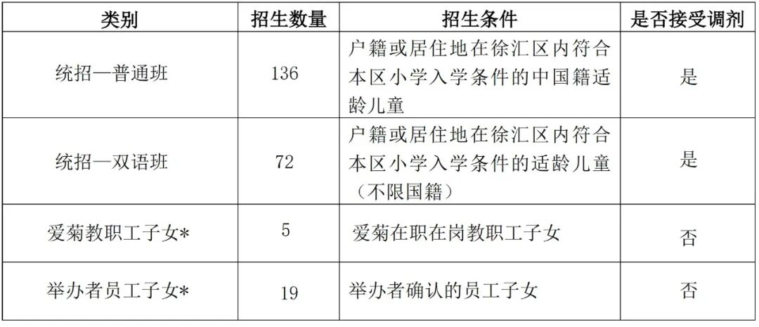 | 上海市徐汇区民办爱菊小学(统招—普通班) | 137 | 户籍或居住地在徐汇区内符合本区小学入学条件的中国籍适龄儿童 | 是 |