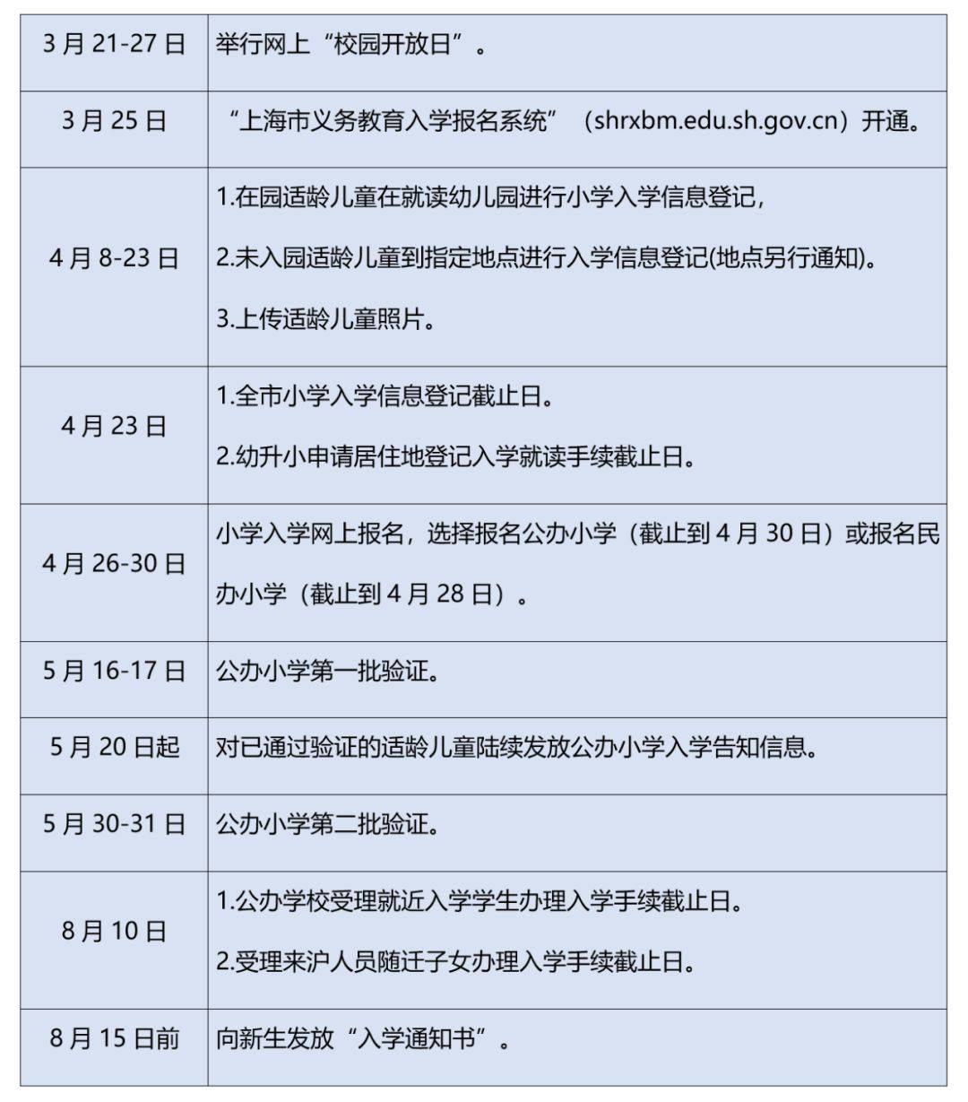 符合入学条件的适龄儿童家长,在“一网通办”网站义务教育入学专栏(zwdt.sh.gov.cn)“上海市义务教育入学报名系统”(shrxbm.edu.sh.gov.cn)进行入学报名和信息核对。其中,公办小学网上报名时间为6月22日-6月26日。