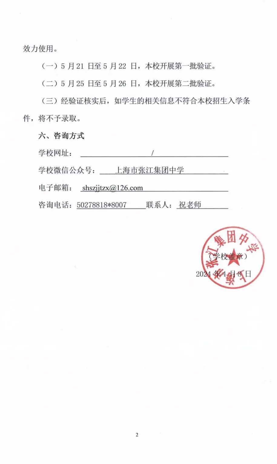 5月29日前,招办通过“上海市义务教育报名系统”或手机短信,向学生家长发出公办小学第二批验证通知,告知公办学校验证安排,5月30日-5月31日学生家长持相关证件(原件)前往相应的公办小学进行现场验证。