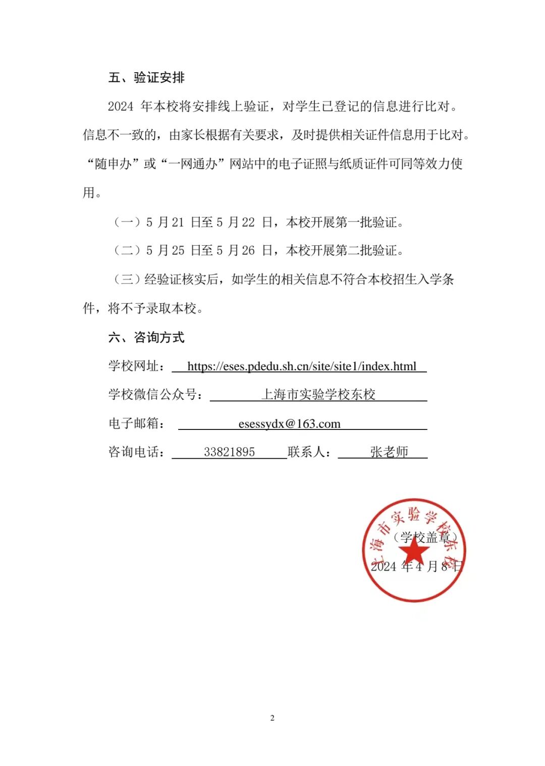 2020年5月16—5月17日为本校第一批验证日。第一批验证对象为本校对口招生地段内完成入学信息登记,并选报公办小学的适龄儿童。家长须根据收到短信通知或“入学报名系统”查询的相关信息按时到校进行验证,家长须带领适龄儿童,携带户口簿、《上海市小学入学信息登记表》等相关证明(原件)到校验证。