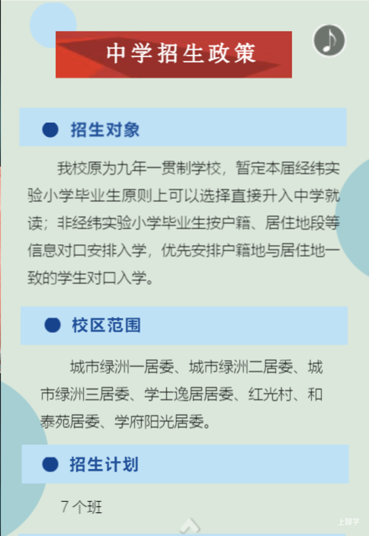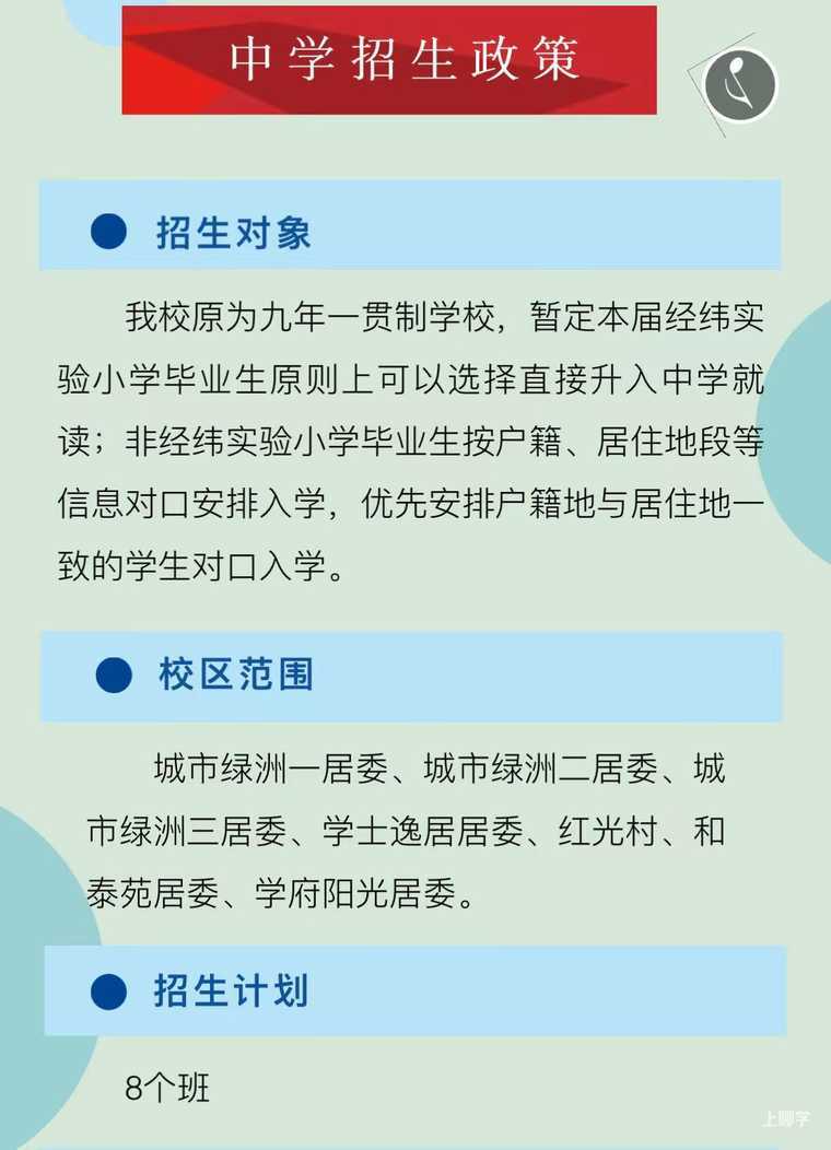 我校原为九年一贯制学校,暂定本届经纬实验小学毕业生原则上可以选择直接升入中学就读;非经纬实验小学毕业生按户籍、居住地段等信息对口安排入学,优先安排户籍地与居住地一致的学生对口入学。