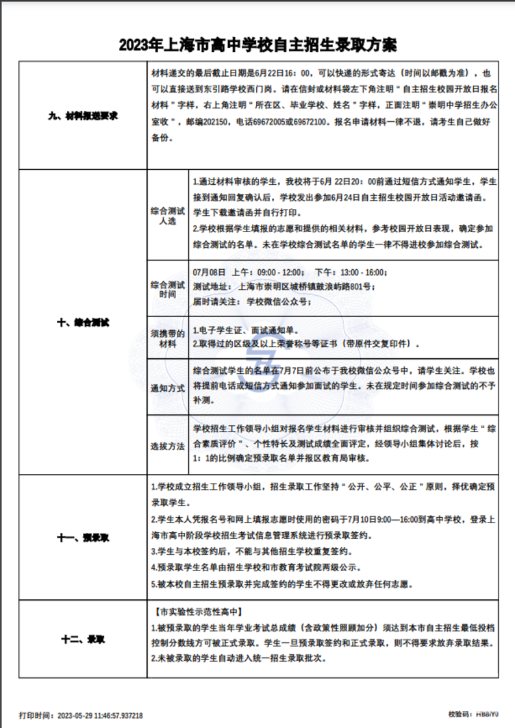 如果你是“自荐生”报考崇明中学,请于5月9日起至5月18日登陆崇明中学微信公众号,网上报名并填写《上海市崇明中学2020年提前招生信息登记表》(请在提前招生录取类别栏内选择“自荐生”),并于5月16日10:00至5月18日10:00在“上海招考热线”(www.shmeea.edu.cn)网站进行网上填报志愿。同时在5月20日16:00之前,请将本人材料投递至崇明中学西门岗。经崇明中学审核通过取得面试资格的考生,将于5月23日到校参加面试(综合测试),学校将择优确定预录取资格名单。