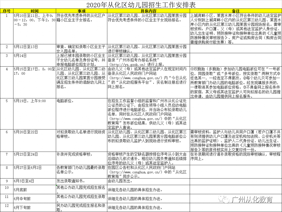 五、招生办法 (一)电脑派位招生 1.适用的幼儿园 教育部门办幼儿园:从化区幼儿园、从化区第二幼儿园、从化区第三幼儿园、从化区第三幼儿园莱茵分园。 2.招生方式 (1)从化区幼儿园、从化区第二幼儿园面向社会以电脑派位的方式招生,电脑派位的比例为招生学位数的90%。 (2)从化区第三幼儿园、从化区第三幼儿园莱茵分园分别优先招收上城湾畔小区和莱茵水岸小区业主子女入园,招生学位数的90%在优先考虑小区业主子女入园的情况下,剩余学位面向社会以电脑派位的方式招生,当小区业主子女人数超出招生学位数时,采用摇号进行分配。 (3)面向社会电脑派位招生后剩余的10%学位由各幼儿园自主招生。 3.招生工作具体安排 (1)公布、申报招生计划 4月28日至5月7日,在从化电台、从化电视台、今日从化、从化区人民政府门户网站(http://www.conghua.gov.cn/)中的“从化区教育局”等媒体向社会公布《广州市从化区2020年幼儿园招生工作方案》。 5月8日至13日,从化区幼儿园、从化区第二幼儿园登录“广州市招考办报名系统”(http://yz.gzzk.cn)申报电脑派位招生计划及幼儿园招生信息。 5月14日,从化区第三幼儿园、从化区第三幼儿园莱茵分园登录“广州市招考办报名系统”(http://yz.gzzk.cn)申报电脑派位招生计划及幼儿园招生信息。 (2)报名 5月10日至11日两天,上午9:00-12:00,下午2:30-5:30,为符合优先考虑条件的从化区户籍小区业主子女报名时间。上城湾畔小区、莱茵水岸小区符合条件的幼儿法定监护人分别到上城湾畔小区内的从化区第三幼儿园、莱茵水岸小区内的从化区第三幼儿园莱茵分园现场报名。需审核资料:户口簿、父(母)或其他法定监护人身份证、幼儿出生证明、预防接种证和接种单位出具的《儿童预防接种情况审核报告》、房产证或购房合同(购房合同需提供购房付款发票)等。 若业主子女属于以下两种情况则需提供由区规划和自然资源分局出具、报名当月打印的《广州市个人名下不动产登记结果查询证明》:一是幼儿与父母一直和直系祖辈同住(提供共同户口簿),房产是直系祖辈100%产权,且父母在广州市没有房产和其他居住地的(没有单位分房、自购房、自建房、租房等);二是幼儿父母拥有不完全房产的居住地是其在广州市的唯一居住地。 以上所有资料需提供原件核实并上交复印件一份。 5月12日至13日,从化区第三幼儿园、从化区第三幼儿园莱茵分园审查、确定拟录取小区业主子女入园名单,并将名单在园外公告栏张贴及在网站公示。 5月14日,从化区第三幼儿园、从化区第三幼儿园莱茵分园登录“广州市招考办报名系统”(http://yz.gzzk.cn),上报已被本园录取的小区业主子女幼儿名单及身份证号,并申报电脑派位招生计划。 5月15日8:00至17日17:00,从化区幼儿园、从化区第二幼儿园、从化区第三幼儿园、从化区第三幼儿园莱茵分园接受满足招生条件的适龄幼儿网上报名。由幼儿父(母)或其他法定监护人在规定时间内登录从化区人民政府门户网站(http://www.conghua.gov.cn/)内“今日从化”的“从化幼招服务平台”,实名制注册后进行网上报名。 报名其他说明: 双胞胎(多胞胎)参加幼儿园电脑派位可在“一号派位,同园录取”或“多号派位,按实录取”两种方式中任选其一,一经选定不得更改。 每个幼儿只可参加1所教育部门办幼儿园的电脑派位。经发现填报多所的,一律取消其参加电脑派位资格。 不具备网上报名条件的家庭,其父母或其法定监护人可向拟报名的幼儿园提出申请,由幼儿园提供网上报名服务。 (3)电脑派位 5月19日上午9:00,在招生工作监督小组的监督下和广州市从化公证处公证员的公证下,由招生领导小组人员启动电脑派位程序进行电脑派位,并当场公布拟录取幼儿名单,同时在从化区人民政府门户网站(http://www.conghua.gov.cn/)中的“从化区教育局”发布派位结果,供幼儿父(母)或其法定监护人查询。 (4)资格审核 5月20日至22日,各幼儿园负责对拟录取幼儿进行资格审核,并在“广州市招考办报名系统”(http://yz.gzzk.cn)录入审核结果。资格审核时,由幼儿园现场打印《从化区公办幼儿园报名表》,拟录取幼儿的父(母)或其法定监护人对报名信息当场确认,并提供监护人与幼儿共同户口簿(若户口簿不共有则须提供幼儿户口簿及法定机构如法院、公安机关等出具的监护证明)、监护人二代身份证、幼儿出生证、预防接种证和接种单位出具的《儿童预防接种情况审核报告》等的原件核实并上交复印件一份。经资格审核发现电脑派位不符合报名条件的、提供虚假材料或证明材料不齐全且未按时补齐的,以及未在规定时间内前往幼儿园进行现场资格审核的,一律取消其录取资格。 (5)补录 5月23日至24日,资格审核产生的空缺名额按排位序号从小到大由后续幼儿依次递补。幼儿园负责通知后续排位序号的幼儿父(母)或其法定监护人,在补录期间进行递补录取资格的现场审核确认。 (6)公示录取名单 5月27日至6月2日,最终录取名单由幼儿园在园区公告栏和从化区人民政府门户网站(http://www.conghua.gov.cn/)中的“从化区教育局”同步公示。 (7)发出《新生录取通知书》 6月3日至4日,由父(母)或其法定监护人到录取的幼儿园办理注册登记手续,领取《新生录取通知书》,逾期未注册登记的,视为自动放弃学位。 (8)电脑派位未被录取的幼儿可到我区其它各类型幼儿园报名。 (二