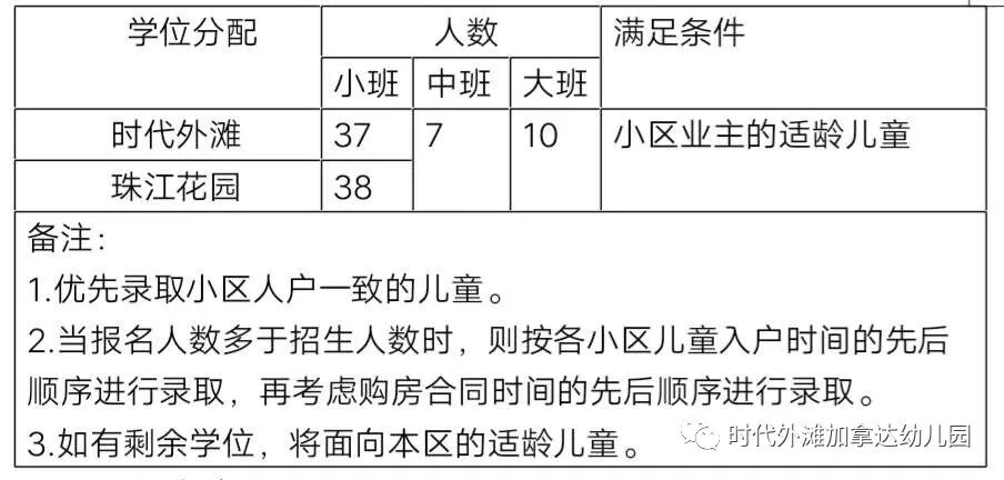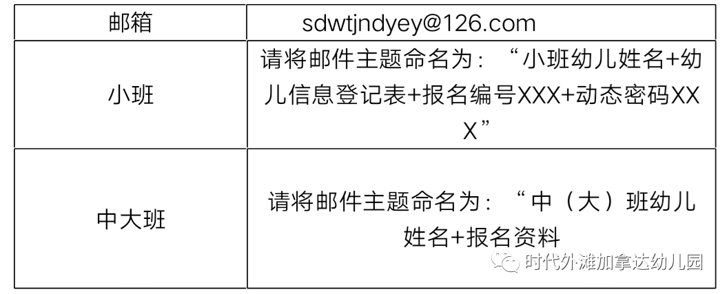 (一)小班幼儿报名时间与流程 1.报名时间:5月18日至5月20日。 2.报名方式:线上报名,幼儿园不接受现场报名。 3.流程:小班幼儿父母或其他法定监护人在我园规定时间内(5月18日至5月20日)进入“广州市番禺区适龄幼儿入园信息登记系统(http://qsy.pyedu.cn),注册后在“入园信息登记”栏目完成信息登记,上传相关资料原件的扫描件(见第六条:报名资料),以获取在番禺区各类幼儿园报读小班的通行证,其中含报名编号和动态密码(24小时有效,逾期需重新生成),并下载“番禺区幼儿入园信息登记表”发送至指定邮箱。 (二)中大班幼儿报名时间与流程 1.报名时间:5月18日至5月20日 2.报名方式:幼儿家长只需扫码“广州市番禺区洛浦街时代外滩加拿达幼儿园中大班级新生报名二维码”填报信息报名即可。 时代外滩加拿达幼儿园中大班级新生报名二维码 3.5月20日前将报名资料(见第六条:报名资料)扫描原件上传指定邮箱。
