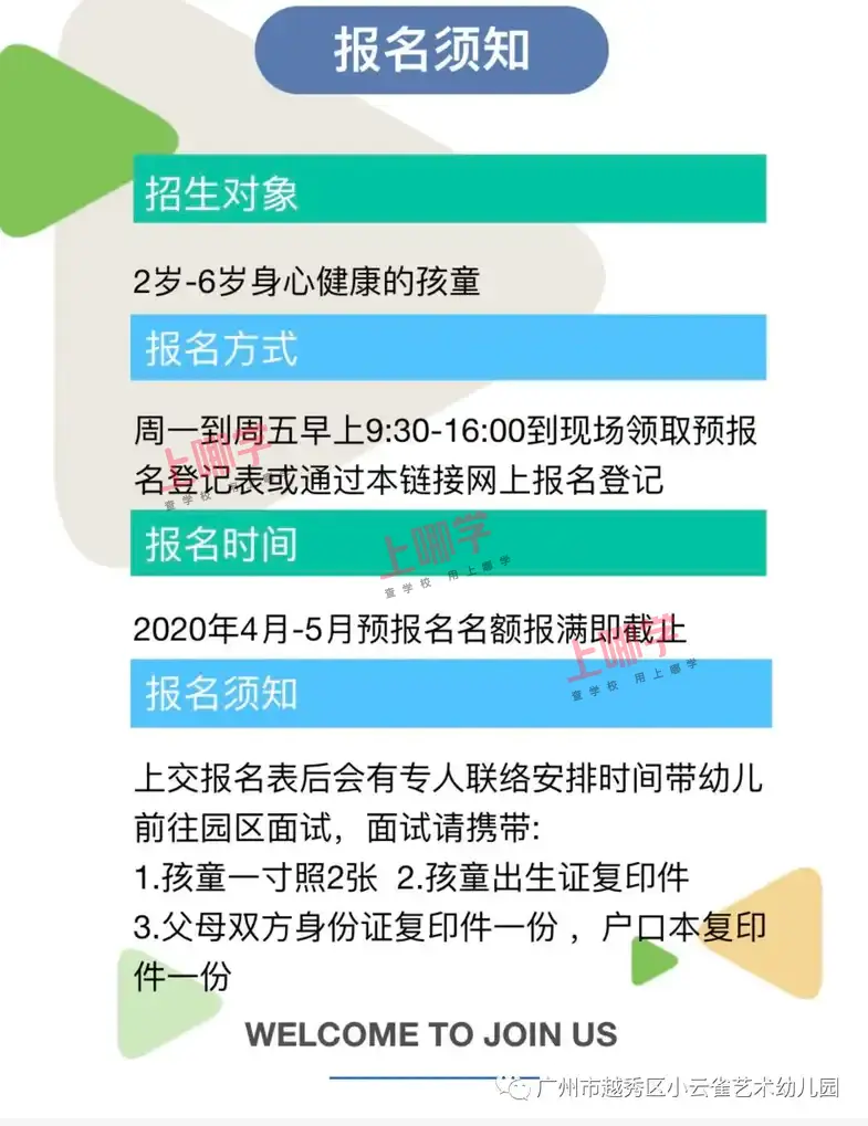 亲爱的家长们,从预报名开始到至今我们幼儿园已陆续收到很多小宝贝们的预报名信息,五月份开始会陆续电话通知联系分批预约面谈,请已预报名的家长留意电话。 请有意向报名的家长扫一扫以下二维码,尽快填写预报名表,我们将择优录取,谢谢大家! 幼 儿 园 简 介 广州市越秀区小云雀艺术幼儿园成立于1999年9月,时任香港律政司司长梁爱诗、广东省人大主任张帼英和东山区区长周庆强以及东山区政协主席郑广祜等领导亲自为幼儿园主持了揭幕仪式,为优化环境,拓展业务,2007年搬至东堤湾继续独立办园,是一所艺术为主导的精品幼儿园。 报 名 须标 知
