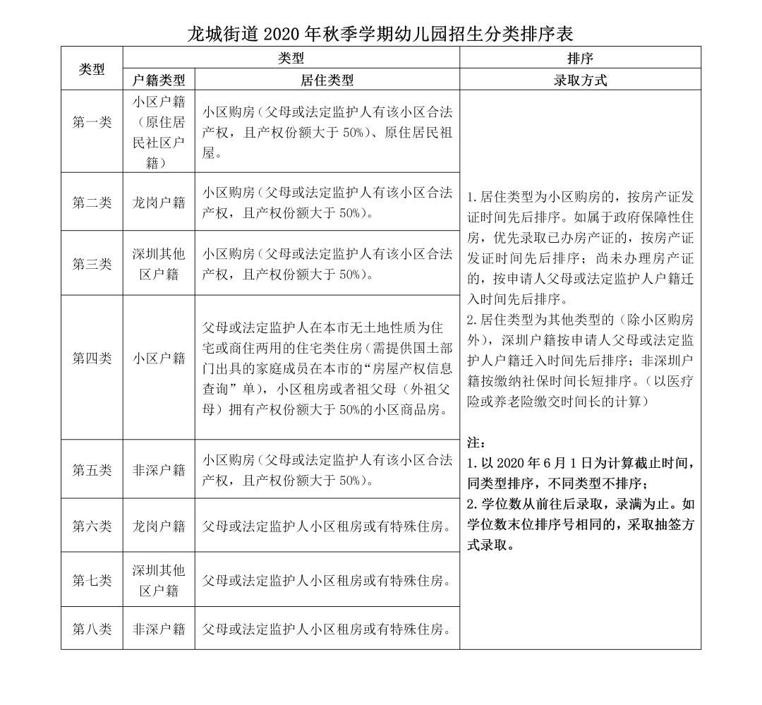 招生公告 根据《深圳市龙岗区教育局办公室关于转发<深圳市教育局关于做好2020年秋季学期全市幼儿园招生工作的通知>的通知》(深龙教办〔2020〕3号)相关要求,现就本园2020年秋季学期招生工作安排通知如下: 园所情况 龙平紫园幼儿园 与您相约 深圳市龙岗区龙城街道龙平紫园幼儿园位于龙岗区龙城街道又一城小区内,是一所全日制公办幼儿园。幼儿园占地面积2709.17㎡,建筑面积2411.84㎡ ,办学规模9个班。幼儿园环境优美,设施齐全,室内外布局合理。四面绿树常青,四季清新。 幼儿园倡导“慢下来,和儿童一起学习”的办园理念,充分阐明了我们的目标是构建一个和谐的儿童与儿童,成人与儿童,一起游戏、工作、思考、创造的时空环境。使得在这个环境中的每一位儿童和教师感到自在、愉悦和幸福。 招生对象 💚小班幼儿:2016年9月1日(含9月1日)后-2017年8月31日(含8月31日)前出生的儿童共3个班90名。 💚中班幼儿:2015年9月1日(含9月1日)后-2016年8月31日(含8月31日)前出生的儿童共43名。 💚大班幼儿:2014年9月1日(含9月1日)后-2015年8月31日(含8月31日)前出生的儿童共70名。 招生范围 一、龙平紫园小区符合条件的适龄儿童。有空余学位时向回龙埔社区招生(无小区配套园的优先),社区招生后仍有空余学位,再向龙城街道内其他社区招生。 二、享受政府相关优惠政策人员子女。 招生时间 2020年6月13日—7月10日 招生程序 01 报名申请 一、填表报名时间:(2020年6月13日-17日) 通过扫码二维码下载并填写《龙平紫园幼儿园新生报名登记表》 二、到园提交报名表时间:(2020年6月18-27日) 到幼儿园现场提交报名登记表。家长确保报名信息表填写完整、真实,在规定时间内将报名表递交到龙平紫园幼儿园保安室,逾期递交将不予受理。 重要提醒:2020年6月28日起幼儿园不再接受任何形式的报名申请。 02 资料筛选 时间:(2020年6月28日-29日) 审核《幼儿报名信息采集表》,根据《龙城街道2020年秋季学期幼儿园招生分类排序表》进行生源分类筛选。 03 通知验资 时间:(2020年6月28日-29日) 幼儿园根据可供的学位数按一到八类的学位类型,通知符合条件的家长分批验资,未接到验资电话的家长请重新择园。 04 现场查验 提交申请资料(查原件,收复印件),招生小组工作人员在现场查验资料。 时间安排: 2020年6月29日-7月3日 上午:9:00—12:00 验资地点: 龙平紫园幼儿园 (龙平紫园小区3号楼B座对面) 需要提供材料如下:(详情请扫描二维码查看资料指引) 1.户口本(祖辈房申请时,申请人需与儿童在同一户口本或提供亲属关系证明); 2.儿童出生证(已办理身份证的需另提交身份证); 3.父母(或监护人)身份证; 4.儿童预防接种证明;(在深圳市预防接种信息系统中建有档案的儿童,家长可直接登录“深圳市疾病预防控制中心http://www.szcdc.net,进入儿童接种信息查询验证系统,进行网上查验并打印。异地接种的儿童或在深圳市预防接种信息系统中没有档案信息的儿童,需持儿童预防接种证到接种单位开具。) 5.住所证明(房产证、房屋租赁合同或其他证明) 由我市规划和国土部门出具的住宅用途的深圳房地产权证书或有效购房合同; 现居住地街道办事处房屋租赁管理所登记备案的住宅用途《房屋租赁凭证》、《房屋租赁信息》或人口居住登记信息(整套房屋且有效期为一年以上),人口登记信息时间需在2020年6月13日前; 监护人在住建部门登记备案的政策性住房的《购房合同》或《租赁合同》; 其它住房有效证明材料。 6.非深户儿童需提供父母一方有效的深圳市居住证或相关证明; 7.港澳户籍适龄儿童除按照非深户籍适龄儿童提供资料外,还需提供香港(澳门)永久性居民身份证、港澳居民来往内地通行证(回乡证)、由公证部门出具的父母与子女间亲属关系公证书(建议在我市、区公证部门办理); 8.属于享受政府特殊优惠政策人员的适龄子女,在申请学位时除应按上述要求提供上述材料外,还应出具优惠政策规定的有关材料。 以上所有证件均需验原件,收A4复印件并按顺序装订。 05 学位申请房锁定制度说明 自2020年秋季起,龙岗区范围内小区配套公办园全部实行学位锁定制度(在此前已实施此项制度的公办园继续实施;在此前未实施此项制度的公办园,已被用来申请学位的住房不会受到影响)。一套住房只能允许一户住户的孩子申请学位,如同一套房有多个孩子申请,必须是同一父母或法定监护人;孩子被公办园录取后,即视为用于申请学位的住房被锁定。“小班”开始使用锁定时间3年,转学插班使用的,锁定时间为入读年级至大班毕业。锁定期间不允许其他家庭子女申请就读公办园。 06 居住材料具体说明 1.房产证(或不动产权证):已购房但房产证(或不动产权证)原件在银行抵押的,提供房产证(或不动产权证)复印件和“不动产权资料电脑查询结果表”;已购房但房产证(或不动产权证)尚未办理的,提供国土部门统一样本的购房合同原件和“不动产权资料电脑查询结果表”。 2.房屋租赁凭证:由龙岗区房屋租赁部门出具,租房面积为整套,承租人必须是适龄儿童的父母或法定监护人,租期一年以上并包含2020年的6月13日至9月30日(自2021年秋季起,非深户籍申请人租期包含2020年8月31日至2021年9月30日,且备案时间须在2020年8月31日及以前)。租住在商品房中的,必须提供房屋租赁凭证。 3.特殊住房的相关材料参照小一学位申请相关规