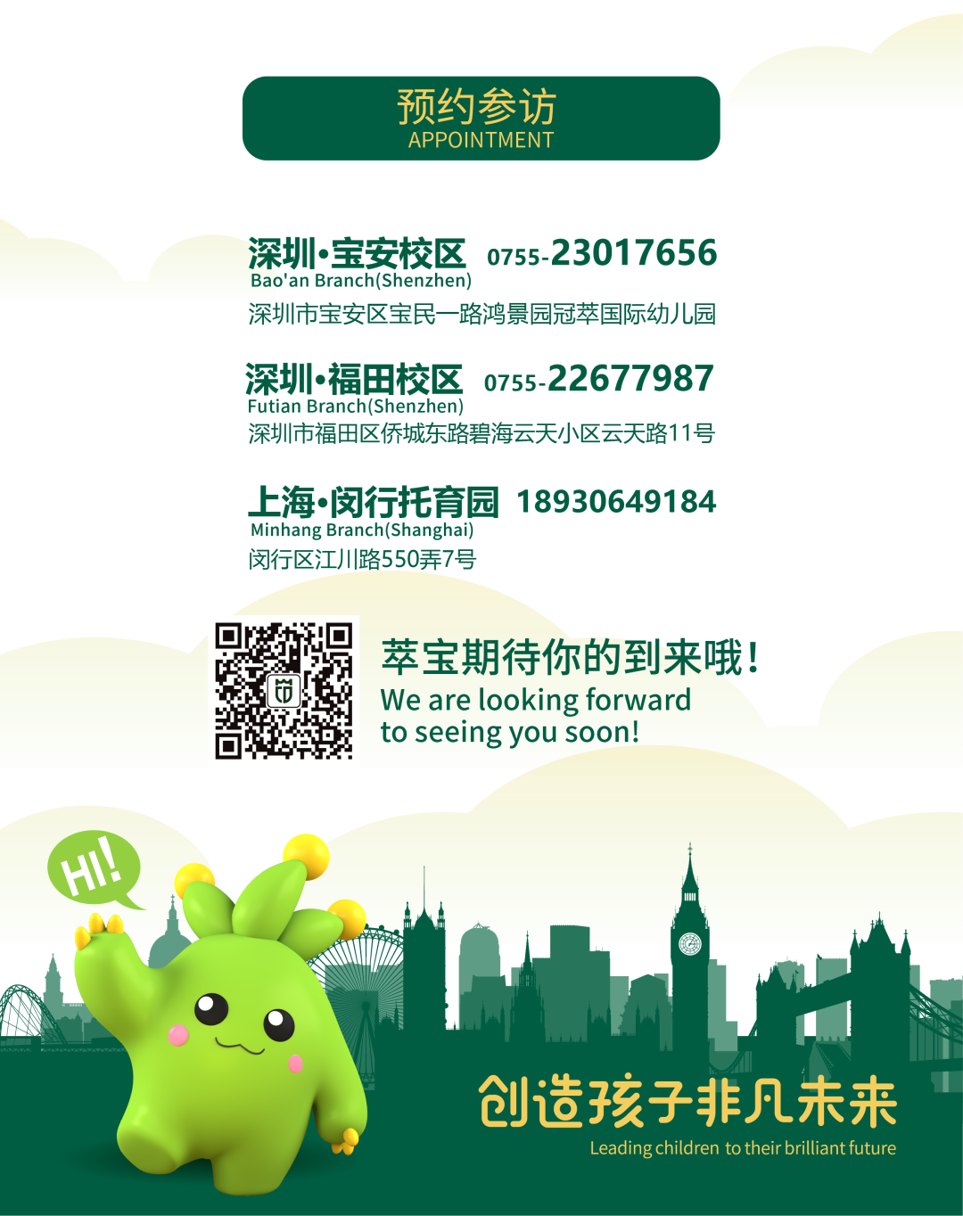 宝安旗舰园秋季招生报名 因疫情原因,幼儿园暂未开学, 我园2020年秋季招生已经开启, 欢迎家长们线上咨询和预约参观。 扫描下方二维码 添加招生官方服务号 冠萃鸿景园校区 报名服务号 咨询电话: 18818526146 Ada老师 18818526246 Helen老师 园所地址: 深圳市宝安区新安街道 鸿景园小区(宝民一路288号)