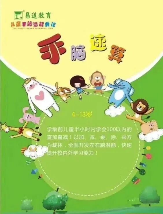 手脑速算:手脑速算是一门有脑记数,用手算数的特色课程,为所有学龄前儿童提前打好幼小衔接基础,并开发了孩子的左右脑思维能力。