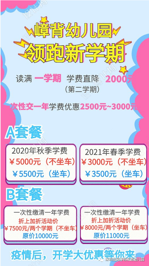成功报读2020年秋季的幼儿即可享受A/B套餐优惠,自己选择优惠方式。