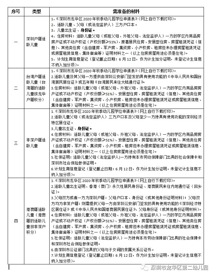 (一)幼儿入园计生信息核对业务渠道:一是网上全流程办理;二是社区工作站综合窗口现场办理。(计生信息登记不再开具纸质“计划生育证明”,将利用计划生育信息系统,实施入园儿童家长计划生育信息后台比对。审核期间,计生信息有修改的,必须在复核前,到社区工作站重新予以登记。如复核时间截止后,计生信息有修改的,结果不予采纳。为避免高峰期办理现场长时间等候,建议家长选择网上全流程办理该业务,手机下载“i深圳”APP,进行新用户注册登录并选择“区级服务”—龙华区—政务服务—个人办事,搜索“入学、入园计生信息核对、录入”事项,进行申办操作。办理进度将以短信形式通知。如收到“预审通过”和“办结”提示短信,表示该业务办理成功,无需再去现场办理;如收到“预审驳回”提示短信,则请家长按照驳回原因重新备齐申请材料、提交申办或者带齐资料前往社区工作站综合窗口现场办理。龙华区各街道社区计生部门咨询电话及地址可扫下方二维码查看。适龄儿童家长可通过注册“广东政务服务网”(http://www.gdzwfw.gov.cn/)或“i深圳”APP账号进行办理,登录后搜索“流动人口信息打印”事项,选择居住地所在街道(仅限打印本人),填报个人信息,选择邮寄,保存递交,将通过“中国邮政速递”方式邮寄给家长。(填写的居住地址必须与网格员上门登记的信息一致)。(一)《儿童入园健康检查表》(到龙华区妇幼保健院进行体检,地址:龙华区大浪办事处华旺路68号,咨询电话:29821199转2)。(二)《儿童预防接种证复印件》及《查验证明》(由辖区社康中心查验后提供证明)。(一)招生地点:资料提交初审安排在龙华区第二幼儿园一楼大厅,初审类型、录取情况公示在龙华区第二幼儿园大门口公示栏和微信公众号。(二)幼儿园初审时,家长携带各项资料原件(另备一套复印件)提交给幼儿园,幼儿园初审合格后,开具回执。对不符合入学条件的幼儿,幼儿园一律不受理其入学申请。未按时向幼儿园交齐初审材料视自动放弃学位申请,不再受理。(三)已安排学位而不按时到园注册者,幼儿园将不保留学位。(四)初审能否过关,以招生范围划分和上交申请资料的真实完整有关,在指定时间内上交资料的前提下,和上交材料的先后顺序无关。因此,递交资料时,敬请家长不要提前排队。 (五)学位申请材料真实性责任:家长对申请材料的真实性负全责,提供虚假材料的,一经查实将取消学位申请资格并记录在案,涉嫌犯罪的,移交司法机关处理。(六)非深户父母至少一方持有具有使用功能的《深圳经济特区居住证》,在深圳居住满一年、连续参加社会保险(养老保险和医疗保险)满1年。请家长查询社保缴费状态,确保养老保险和医疗保险两种险种在申请学位当年的7月份前都处于正常缴费状态(社保积分计算截止日期为2020年5月31日)。(七)租房的家长,须提交2020年6月13日前办理好的租赁凭证(信息),且要确保房屋租赁凭证(信息)在正式入园前(2020年9月)处于未过期状态(积分计算截止日期为2020年5月31日)。租房但未办理房屋租赁凭证或房屋租赁信息的,需提供2020年6月13日前与房东签订的房屋租赁合同、学区房使用授权书(附件2),以及父母(或监护人)一方的《内地居民采集表》。(八)幼儿园报名已实行学位房锁定(期限三年),学区内同一套住房(含集体宿舍、公共租赁房)用于申请学位时,在学制期间,幼儿园3年只允许一户家庭的孩子申请学位。如同一套住房有多个孩子申请学位,必须是同一父母、祖父母、外祖父母或法定监护人,招生报名系统不接受同一套住房重复申请学位。请申请阳光招生试点幼儿园学位的家长在购房或租房之前先确认该房屋学位是否已被使用(所有的住房房屋用途必须是住宅)。(九)如出现因录入信息错漏等原因导致审验结果不合格,家长须按所报幼儿园要求进行信息复核,修改后的信息将再次送相关职能部门核验,材料复核期间,家长可自行登录阳光招生网上报名系统查询最终复核结果。复核结束后,家长相关修改信息及审核结果不予采纳。(十一)家长在网上填报的信息直接影响材料审验结果和学位安排,请家长务必确保录入信息准确无误。(十二)家长在网上填报的手机号是接收幼儿园有关报名通知的主要工具,请务必保证电话畅通。