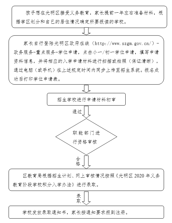 (一)网上预报名 公办、民办学校同一标准,同一时间,同一系统申请。 公办、民办学校小学一年级:5月14日9:00-5月20日17:30 公办、民办学校初中一年级:5月15日9:00-5月21日17:30 家长登录光明区政府在线(http://www.szgm.gov.cn/)-政务服务-重点服务-学位申请,点击小一/初一学位申请,填写申请资料信息,并将相应的入学申请材料进行扫描或拍照(保证清晰),通过电脑(或手机)在上述规定时间内同步上传至招生系统。家长应确保填写提交的信息准确、真实,对申请材料的准确性、真实性负责。凡在规定时间内提出的申请,均为有效申请。报名成功后,打印学位申请表。 每位符合条件的适龄儿童需填报三个志愿:第一志愿可填报公办学校或民办学校(民办学校六年级毕业生填报本校初一年级作为第一志愿的,视为直升,不计积分,优先录取);第二、三志愿为民办学校志愿,必须填报。(具体录取办法参见《光明区2020年义务教育阶段学校积分入学办法》)。 网上预报名期间,教育局将在学位申请网站每天公布截止到当天17:30(最后一天为当天上午11:30)时各学校报名数据,包括招生计划、报名人数(含各类型报名具体人数)等信息。家长可根据自身情况,调整填报学区内学校。 (二)招生学校进行申请材料初审 公办、民办学校小学一年级:5月21日-5月25日 公办、民办学校初中一年级:5月22日-5月26日 招生学校在招生系统中查看申请材料是否齐全、证件填写信息是否与系统相符(家长不用到学校),材料齐全则予以初审通过,材料不齐或不符合申请条件,则在系统中否决,并注明原因。 (三)各职能部门进行资格审核(5月26日—7月12日) 各职能部门通过电子比对等方式对入学申请材料进行审核,区教育局组织人员对各校材料进行抽检与复核,并将审核情况在招生系统内进行反馈。家长自行登录系统查看审核情况。 (四)家长、招生学校进行复核(7月13日-7月14日) 家长对审核结果有异议的,可咨询相关职能部门,确定所提供证件真实有效后,带相关证件原件到申请学校申请复核。除填写错误、审核失误等原因外,其他情形(包括因提供虚假信息或材料导致审核不合格的)不允许补交材料。7月14日17:00后停止受理任何复核申请。 (五)学位安排及录取(7月下旬) 区教育局根据招生计划、网上审核情况,按照《光明区2020年义务教育阶段学校积分入学办法》进行录取。各义务教育学校在学校门口张榜公布录取名单,并及时通知家长注册事宜。