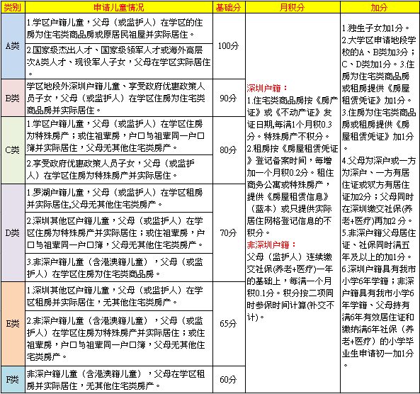 2.积分。积分由“基础分+月积分+加分”构成。(1)基础分:按不同的类别给予基础分,A类100分、B类90分、C类80分、D类70分、E类65分、F类60分。(2)月积分:根据申请儿童及父母的户籍、居住、社保等不同情况按月积分。深圳户籍儿童:①学区住房为住宅类商品房的按《房产证》发证日期,每满1个月积0.3分。特殊房产不积分。②学区租房按《房屋租赁凭证》签署(备案)日期,每满1个月积0.2分。租住商务公寓或特殊房产,提供《房屋租赁信息》(蓝本)或只提供实际居住网格登记信息的不积分。非深圳户籍儿童: 申请儿童父母(监护人)连续缴交社保(养老+医疗)一年的基础上,每增加1个月积0.1分。积分按二项同时参保时间计算(补交不计)。如果参保时间不一致,则按参保时间较短险种计算(以社保局比对验核结果为准)。(3)加分。①独生子女加1分。②实行大学区招生的地段,申请原地段学校的A、B类加3分;C、D类加1分。③住房为住宅类商品房或租房提供《房屋租赁凭证》加1分。④父母为深户或一方为深户、一方有居住证或双方有居住证加2分;父母同时在深圳缴交社保(养老+医疗)再加2 分。⑤非深户籍父母居住证、社保同时满五年及以上的加1分。⑥深圳户籍具有我市小学6年学籍,非深户籍具有我市小学6年学籍、父母持有满6年有效居住证和缴纳满6年社保(养老+医疗)的小学毕业生申请初一加1分。(注:④⑤⑥项单亲家庭视实际情况加分。离异家庭能同时提供孩子父母双方居住证和社保证明且符合条件的,享受同样加分。)