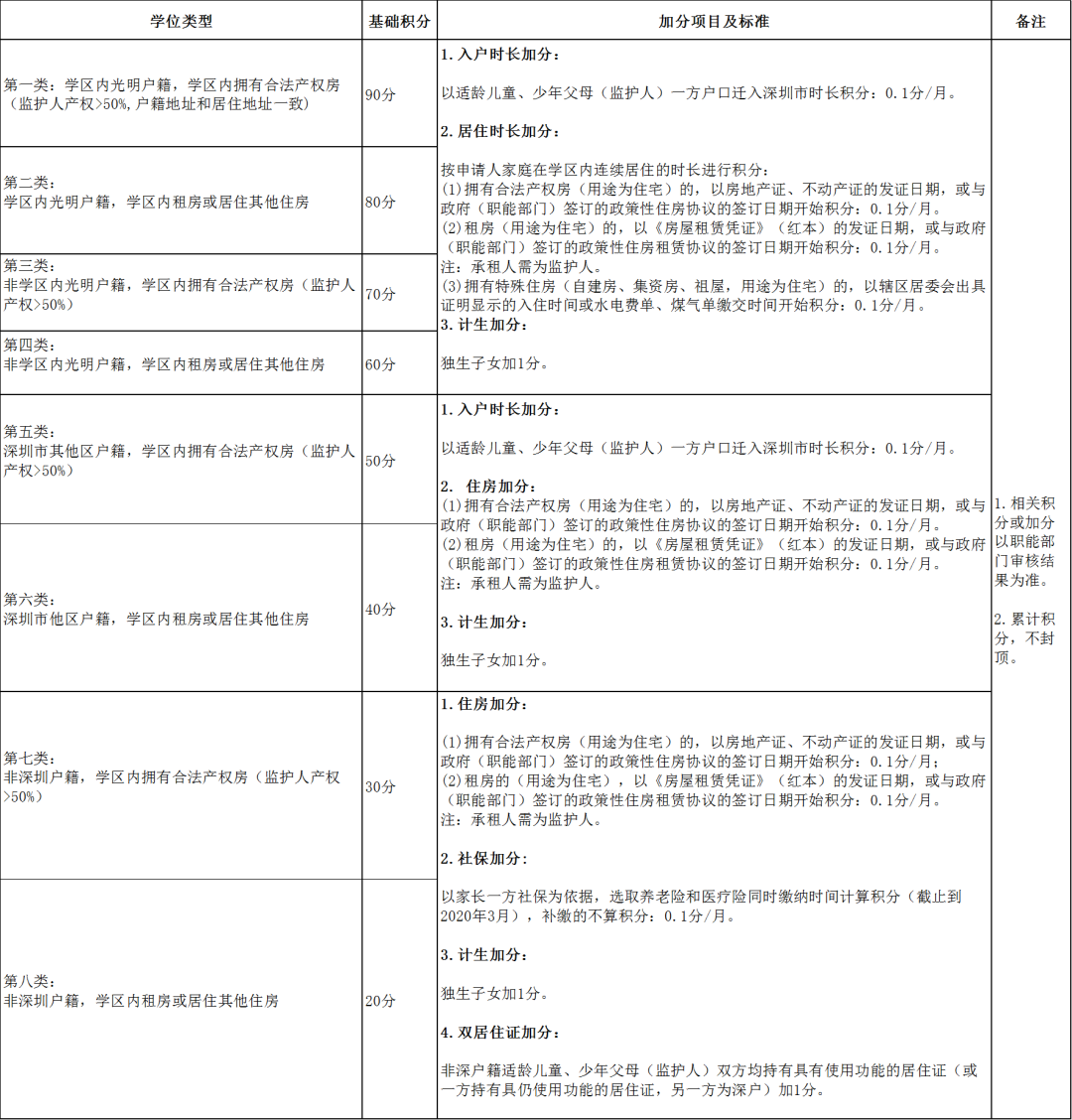 光明区义务教育阶段学位类型按照适龄儿童、少年户籍和家庭购房情况分为八类,积分项目及标准如下: