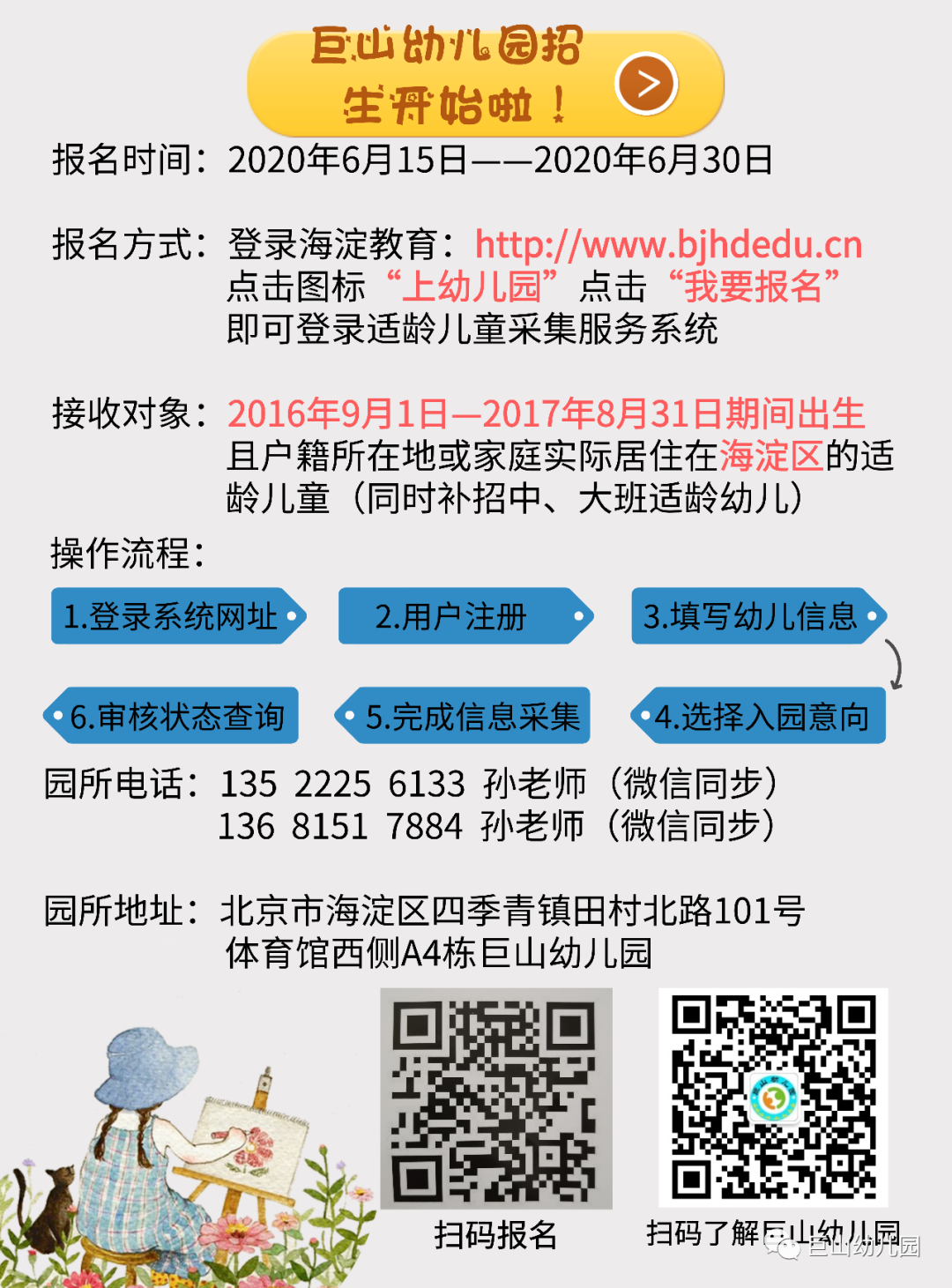巨山幼儿园创建于2013年5月,位于美丽的西山脚下—四季青镇巨山村,园所占地面积有3791㎡,办园特色鲜明、管理规范有序、队伍和谐精进、环境至爱温馨、幼儿快乐发展、家长认可满意。积极向上、团结友善、充满爱心、健康活泼。