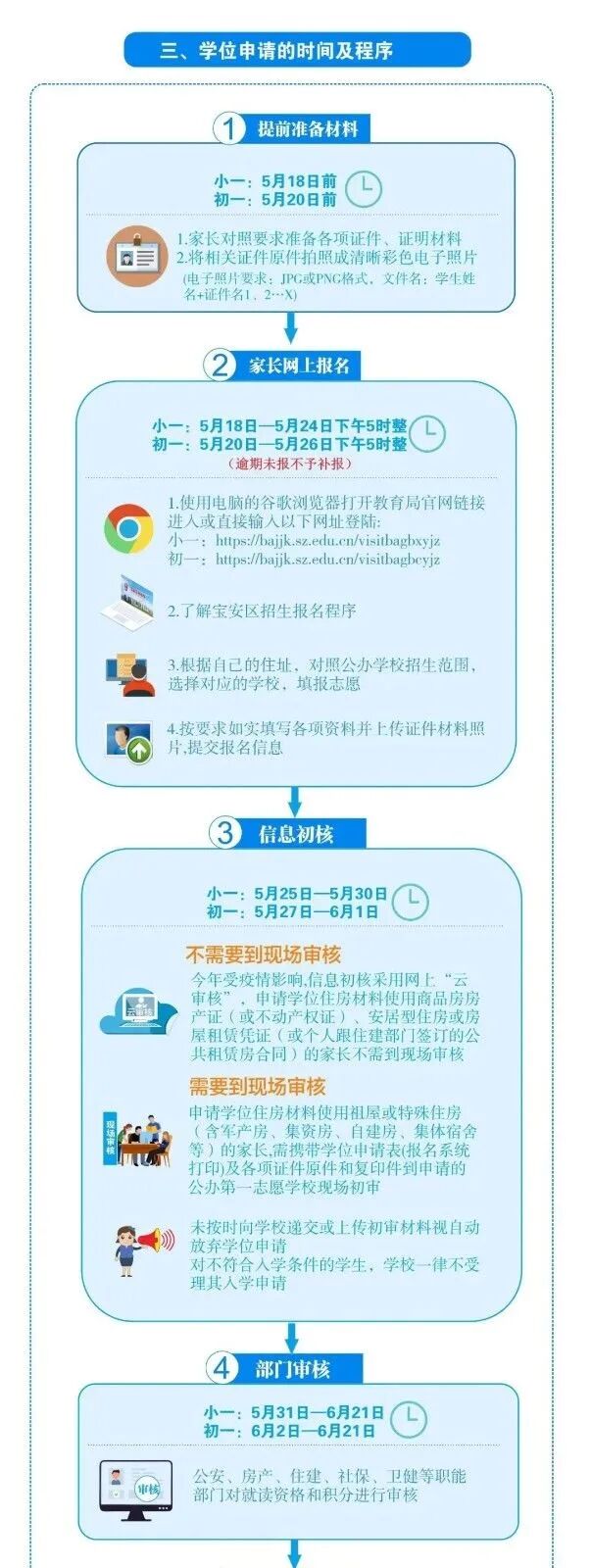 今年信息初核环节继续进行“云审核”,家长在网上报名填报信息的同时还需要上传所有资料、证件的扫描件或照片,请家长在报名前,提前将纸质证件扫描或拍照保存。具体要求请家长及时查看并学习《宝安区2022年秋季新生入学指引》,在规定时内按要求进行报名并配合学校完成资料审核工作,切勿错过报名时间和初核时间。