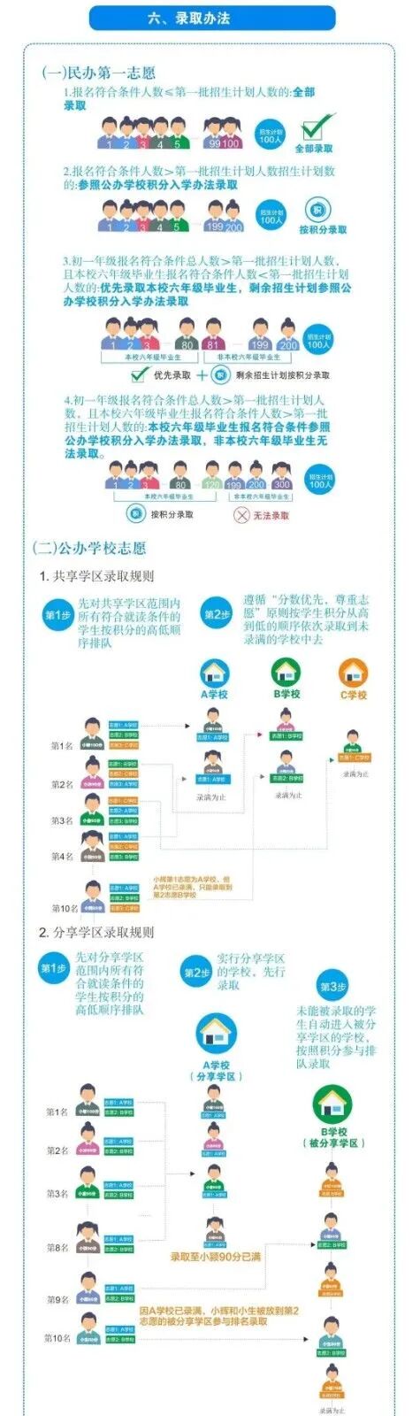 1.共享学区:如果A、B两所学校组成共享学区,那么这两所学校范围内的学生,一共可以选择2个志愿,志愿顺序由家长选择;如果A、B、C三所学校组成共享学区,那么这三所学校范围内的学生,一共可以选择3个志愿,志愿顺序由家长选择;以此类推。