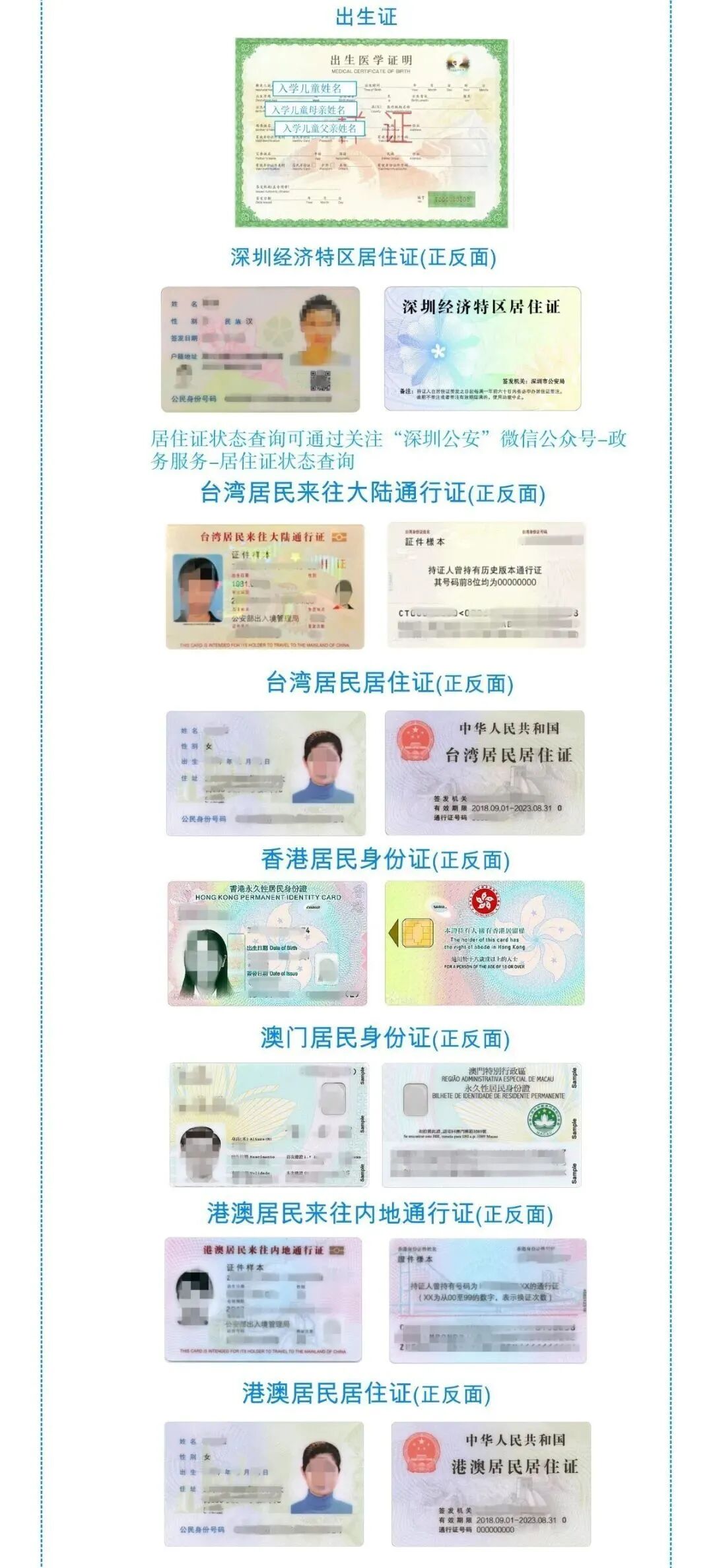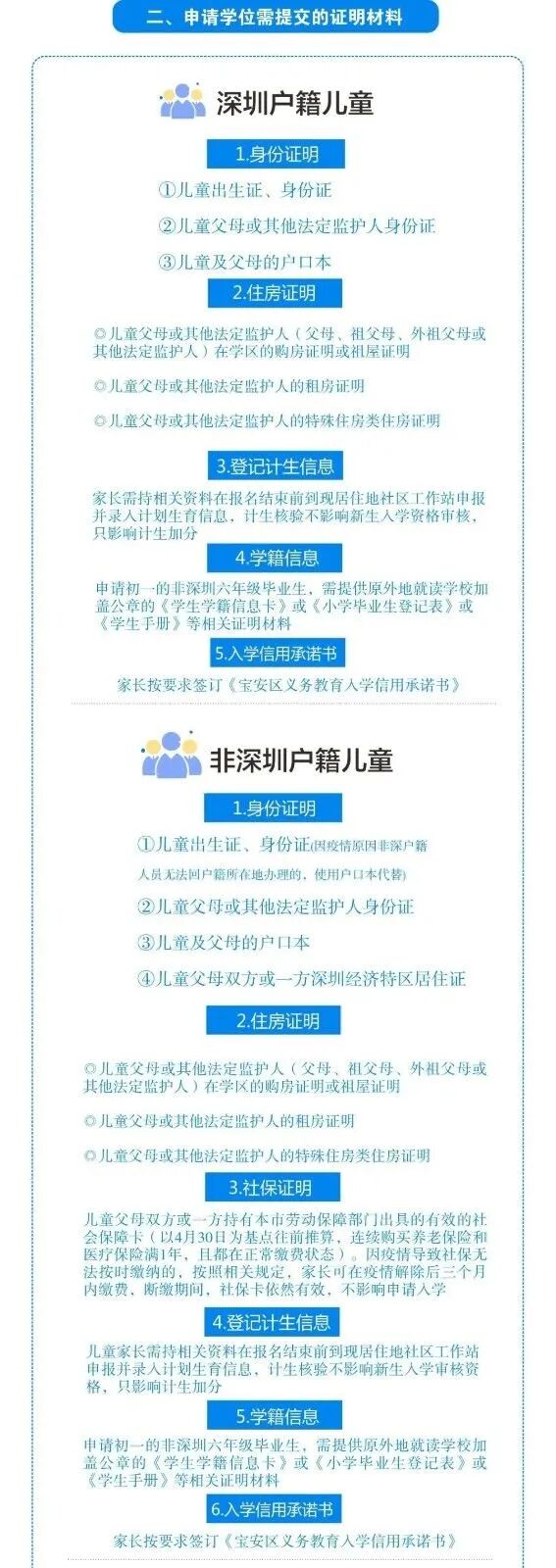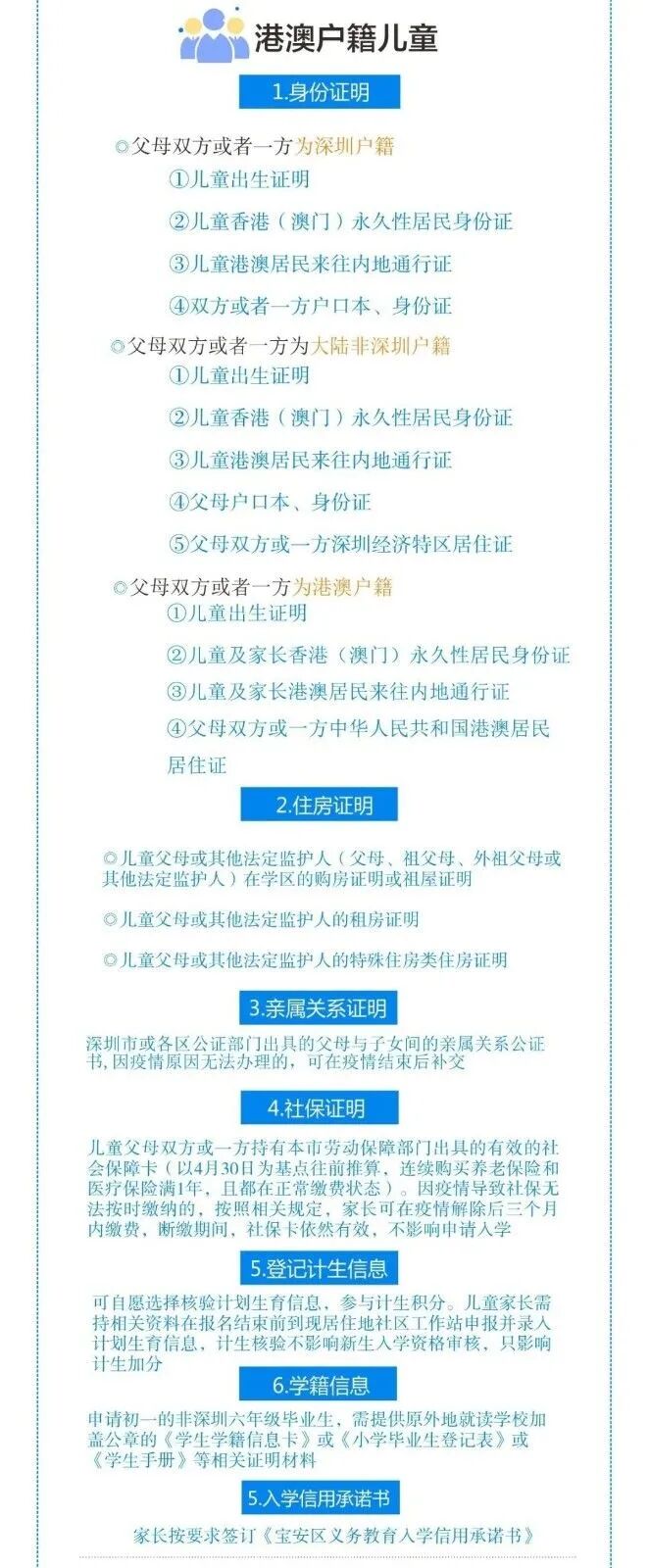 (1)身份证明:适龄儿童、少年的出生证明、香港(澳门)永久性居民身份证、港澳居民来往内地通行证(回乡证);父母双方或者一方为深圳户籍的,提交父母户口本、身份证(或其他身份证明材料);父母双方均为非深户籍的,提交父母《深圳经济特区居住证》或《中华人民共和国港澳居民居住证》、身份证或其他有效身份证明;