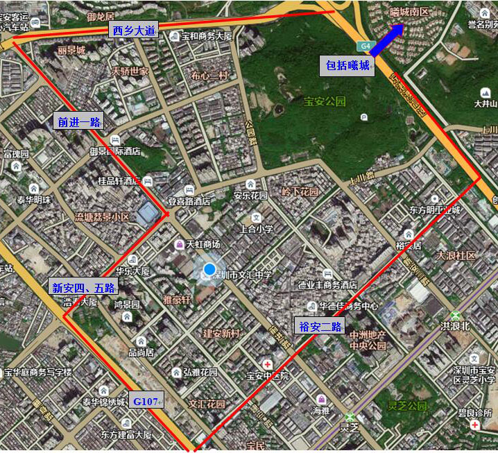 1.107国道以东,广深高速公路以西,裕安二路以北,新安四路、新安五路以南区域(包括29-36区等);2.前进路以东,宝安公园以西,新安四路以北,西乡大道以南区域(73-76区等)及曦城。