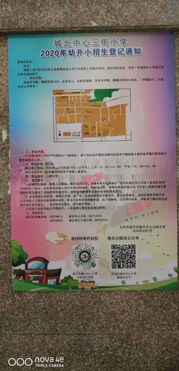 1.疫情常态化防控期间,避免人员聚集,确保校园安全,请家长用手机微信扫“昌平区城北中心小学入校预约系统”小程序的二维码,注册登录后,完善相关信息并按入学方式预约时间段,预约成功后,按预约系统中提示的《小学入学报名登记携带材料相关要求》准备原件和复印件,按预约的时间节点准时去学校报名登记。