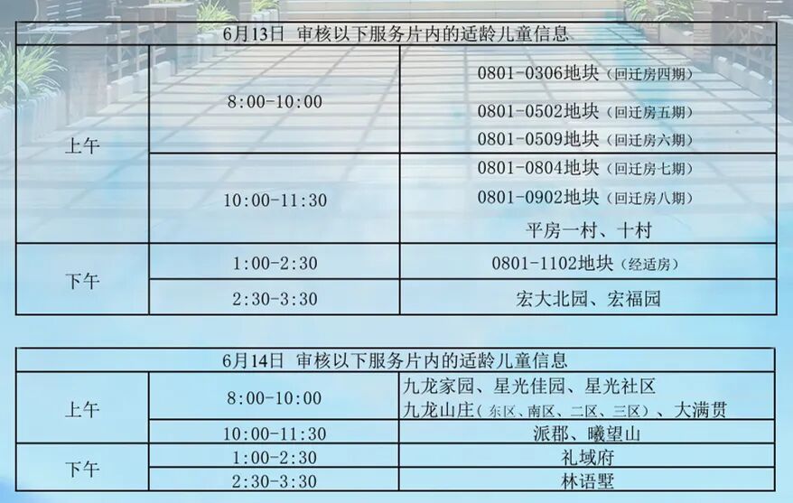 1 招生对象 Enrollment target 年满六周岁(2013.9.1—2014.8.31),具有北京市常住户籍,且在学校服务范围内购房居住的适龄儿童。 年满六周岁(2013.9.1—2014.8.31),符合市区级教育部门入学政策的,在学校服务范围内购房居住的非京籍适龄儿童。 2 入学条件 Entrance requirements 1. 大兴区户籍且第一监护人(父或母)在服务范围内购房(100%产权且已入住的房产)、户籍和房产在一起的。 2. 大兴区户籍且第一监护人(父或母)在服务范围内购房(100%产权且已入住的房产)、户籍和房产不在一起的。 3. 大兴区户籍且购房(房子是直系祖辈100%产权且已入住的房产),且三代人户籍在一起的(即:孩子、父母、祖父母或外祖父母),且第一监护人名下确实没有房产的。 4. 北京市户籍且第一监护人(父或母)在服务范围内购房(100%产权且已入住的房产)、户籍和房产不在一起的。 5. 本市户籍无房家庭,长期在非户籍所在区(大兴区)工作、居住,符合在大兴区连续单独承租实际居住3年以上且在住房租赁监管平台登记备案、夫妻一方在该区合法稳定就业3年以上等条件的,其适龄子女可由区镇教委根据租住地学校学位情况协调入学。 6.非北京市户籍的适龄儿童,第一监护人(父或母)在学校服务范围内购房且已居住的,且各方面条件符合市区级教育部门入学政策的,学校根据实际接收能力接收。 3 入学服务范围 Community 【宏大北园】 【宏福园】【礼域府】 【星光佳园】 【派郡】【九龙家园】 【大满贯】 【曦望山】 【林语墅】 【平房一村】 【十村】 【九龙山庄(东区、南区、二区、三区)】 【0801-0306地块(回迁房四期)】 【0801-0502地块(回迁房五期)】 【0801-0509地块(回迁房六期)】 【0801-0804地块(回迁房七期)】 【0801-0902地块(回迁房八期)】 【0801-1102地块(经适房)】 4 招生计划 Enrollment plan 【六个班】 5 审核入学信息的时间及安排 The arrangement and time to review admission information 1. 招生宣传时间:6月2日(周二) 2. 审核招生时间:6月13-14日 3. 具体安排: 4. 审核信息地点:北京第二实验小学大兴实验学校尚美楼 6 信息审核所需材料(原件审查、复印件学校留存) Materials 1.北京市户籍适龄儿童所需材料: (1)学龄人口网上信息采集表原件。 (2)房产证(或购房合同原件或回迁协议)、原始购房发票原件及复印件各一份。 (3)全家人的户口本原件及户口本首页、孩子本人页和父母户口页复印件各一份。 (4)父母身份证、结婚证、孩子的出生证明原件及复印件各一份。 2.符合条件的非京籍适龄儿童除携带以上材料外,还需携带: (5)父母双方在京实际住所居住证明、北京市居住证(或有效期内居住登记卡)、在京务工就业证明(或劳动合同、聘任合同、营业执照)、原件及复印件各一份。 注: ①报名时由一名家长持相关材料到现场(不带孩子),并严格按照疫情防控相关要求,配合学校做好扫健康码、测温、登记、保持1米线等相关事宜。(疫情期间请家长务必重视,严格遵守!) ②报名时带孩子近期两寸免冠照片1张,照片背面用圆珠笔写好孩子姓名。 7 发放入学通知书时间 发放入学通知:7月6日(周一) 具体时间:早8:00-10:00 领取地点:尚美楼 温馨提示: 1. 为保证孩子顺利入学,请服务范围内符合入学条件的适龄儿童家长将报名时所需的材料一并准备齐全,以免延误报名。 2. 学校招生工作严格按照通告公布的时间进行,过期不候。 3. “北京市居住证”到大兴区公安部门开具。 “在京务工就业证明”到所在工作单位开具。 4. 如果家长为学校提供任何不真实的虚假信息,后果请自负。 办公室咨询电话:60248993-8523 80252980 姚主任、赵主任家长领取通知书时,请携带一年级新生登记表和全家人户口本。
