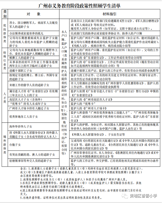 我校将按照《中华人民共和国义务教育法》和上级有关文件的精神,遵照全市“统一时间报名、学校设点审核、统筹安排学位、相对就近入学”的原则,接受年满6周岁的适龄儿童入学登记。 适龄儿童入读条件 凡具有中华人民共和国国籍、当年8月31日(含8月31日)前年满6周岁的儿童不分性别、民族、种族、家庭财产状况、宗教信仰等,应当入学接受规定年限的义务教育。因疾病或特殊情况,需要延缓入学或免予入学的,由其父(母)或其他法定监护人向户籍对应的学校提出书面申请,学校加具意见后报区教育局批准。延缓入学期满,应即入学。 (一) (二) (1)属手续完备的一手房,能提供与其父母或其他法定监护人同一户籍的本区居民户口簿,以及与该户籍一致的房产证或购房发票和购房协议(即户主与业主一致,均为适龄儿童的父(母)或其他法定监护人),且房产为适龄儿童的父(母)或其他法定监护人所拥有的。 (2)属手续完备、已经办理各种交易手续的二手房的,只要该住宅单元以往业主没有小孩在对口地段小学在读1—3年级,且房产为适龄儿童的父(母)或其他法定监护人所拥有,并能提供与其父(母)或其他法定监护人同一户籍的本区居民户口簿,以及与该户籍一致的房产证或购房发票和购房协议的。 (3)属祖辈房产,适龄儿童及其父(母)在广州市11区均无房产的,能提供适龄儿童及其父(母)或其他法定监护人与祖辈在同一户籍(户主须为该同户同住祖辈)的本区居民户口簿,以及与该户籍一致的房产证或购房发票和购房协议(房产须为该祖辈全权所有),且该住宅单元以往业主没有小孩在对口地段小学在读1—3年级的。 (4)适龄儿童及其父(母)均属广州市黄埔区集体户,集体户口与实际居住地址一致,适龄儿童及其父(母)在广州市11区均无房产的;且该适龄儿童自出生前,其父(母)已落户该集体户,该适龄儿童出生后首次入户落户该集体户。 (5)符合广州市义务教育阶段政策性照顾学生条件(具体条件见附件),并经审核批准的照顾学生,能提供其在小学招生地段范围的实际居住地的房产证或购房发票和购房协议、或须提供住建部门认可的房屋租赁备案登记表等有效居住证明。 (三) (1)本区户籍,属手续完备且在租赁合同有效期内的租住户适龄子女,该住房系适龄儿童与父(母)在广州市的唯一居住地,且适龄儿童的父(母)或其他法定监护人在广州市11区均无房产,能提供住建部门认可的房屋租赁备案登记表,承租人为该适龄儿童的祖辈、父(母)或其他法定监护人的。 (2)适龄儿童及父(母)均属广州市黄埔区集体户,集体户口与实际居住地址不一致的,或属于出生后迁移户籍至该集体户者。 (3)因适龄儿童及其父(母)在广州市11区均无房产,而将户籍挂靠在本区户籍居民名下的。 (4)因本区拆迁原因造成户口地址与实际居住地址不一致者。 (5)同一户籍及同一房产或同一租住房,在其对口服务地段学校已经有学生在读1—3年级的(原则上同一户籍地址、同一房产、同一租住房只在辖内学校对应安排一个学位,多子女户除外)。 (6)父(母)持广州市黄埔区广州开发区“万能捷通卡”者,持卡人和其适龄子女均属非穗户籍。 (7)父(母)被认定为广州市黄埔区广州开发区科技领军人才、创新创业领军人才者,被认定人和其适龄子女均属非穗户籍。 (8)符合广州市义务教育阶段政策性照顾学生条件(具体条件见附件),父(母)在我区企业工作,但不在我区实际居住的非穗户籍适龄儿童。 (9)参加我区来穗务工人员随迁子女小学起始年级积分入学,获批准取得入学名额的适龄儿童(具体办法另行通知)。 (10)具有本市其他区户籍,在本市无自有产权住房,且在我区租赁房屋所在地系唯一居住地,该房屋以往业主或住户没有小孩在我区公办小学在读1—3年级的,须持住建部门认可的房屋租赁备案登记表,合同须同时满足至本年度4月30日已租住本房屋满一年或以上、且往后租期不少于3年的承租人适龄子女。 报名需要提交的资料 (一) 1、适龄儿童父或母为业主的房产证复印件(近期已购房但暂未办理房产证的,需提供购房综合税发票和购房合同),原件备查; 2、与房产证地址一致的户口簿复印件(户口簿中的首页和适龄儿童复印在同一张A4纸上),原件备查; 3、父母户口本复印件,原件备查; 4、适龄儿童出生证明复印件,原件备查; 5、公办小学报名系统打印的《2020年广州公办小学学位申请表》原件。 6、孩子近期小一寸证件照一张。 (二) 1、提供住建部门认可的房屋租赁备案登记表或租房备案证明(出租屋管理中心),原件备查; 2、适龄儿童、父母户口本复印件(户口簿中的首页和适龄儿童复印在同一张A4纸上),原件备查; 3、适龄儿童出生证明复印件,原件备查; 4、公办小学报名系统打印的《2020年广州公办小学学位申请表》原件。(政策性照顾生除外) 5、政策性照顾生参照附件提供对应材料,原件备查; 6、孩子近期小一寸证件照一张。 报名方式 招生工作日程安排 特别说明 1、 2、 招生联系电话 附件:(点击可看大图) 广州市黄埔区香雪小学 二〇二〇年四月二十四日