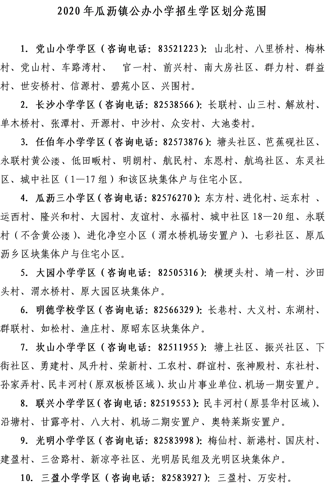 东方村、进化村、运东村 、运西村、隆兴和村、大园村、友谊村、永福村、城中社区18-20组、永联村(不含黄公溇)、进化净空小区(渭水桥机场安置户)、七彩社区、原瓜沥乡区块集体户与住宅小区